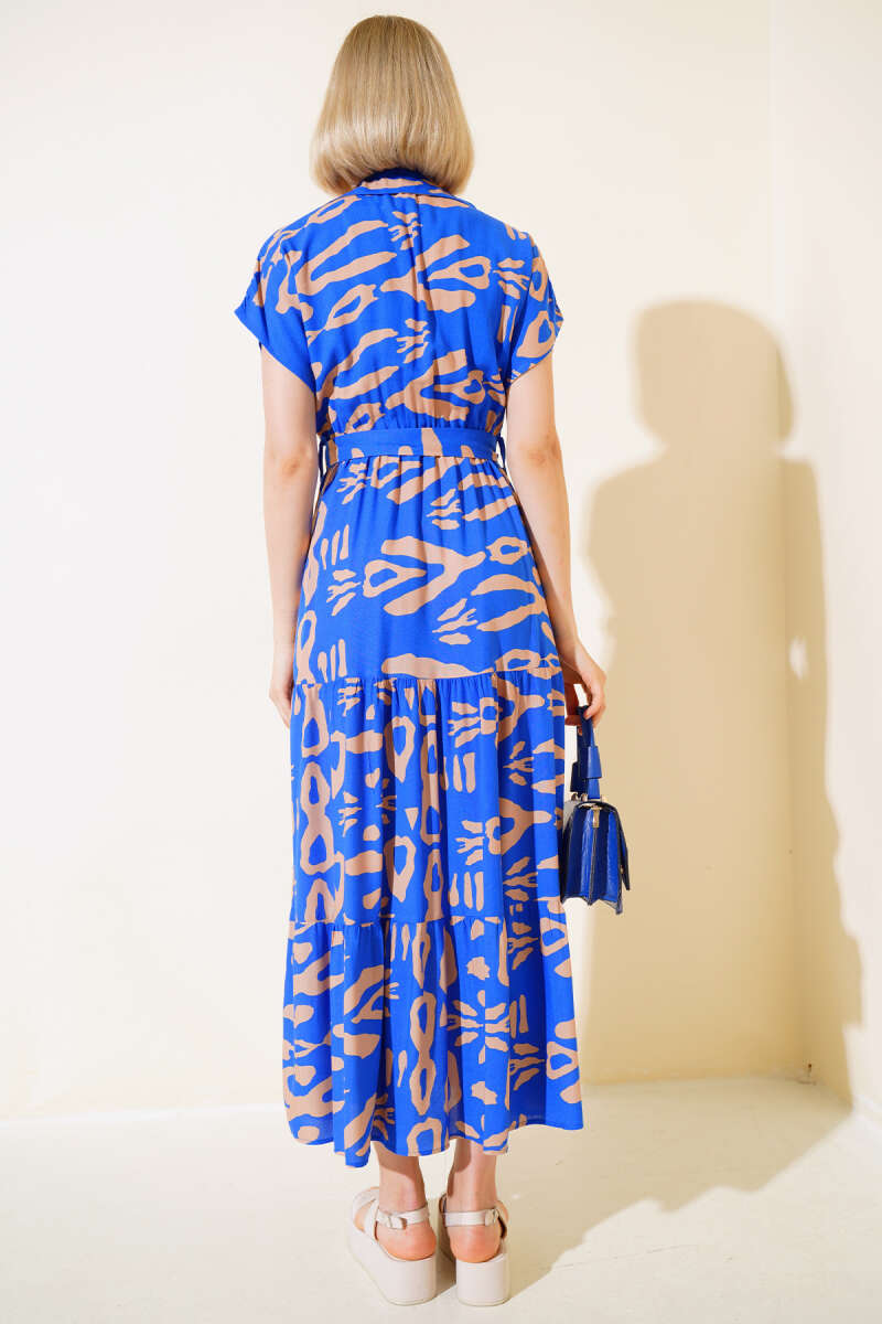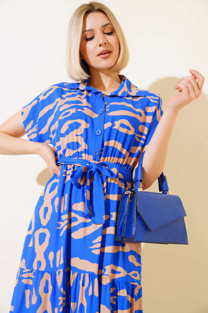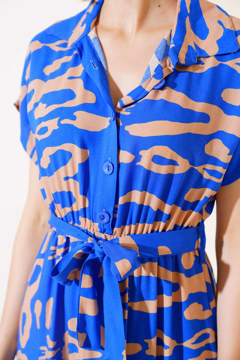Desenli Kısa Kol Elbise Saks
