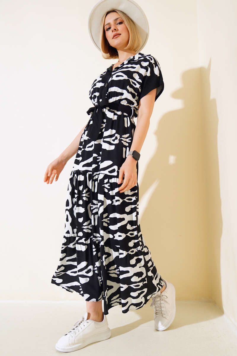Yeni sezon elbise modelimiz sizlerle beraber. Elbisemiz gömlek yakadır. önü yarım düğmelidir. Elbisemiz kat modeldir. Astarsızdır. Kısa kolludur. Elbisemizin beli lastiklidir. Belinde iki adet kemer köprüsü olup, kendi kumaşından kuşağı vardır. Elbisemiz renk seçenekleriyle beraber sizleri bekliyor.