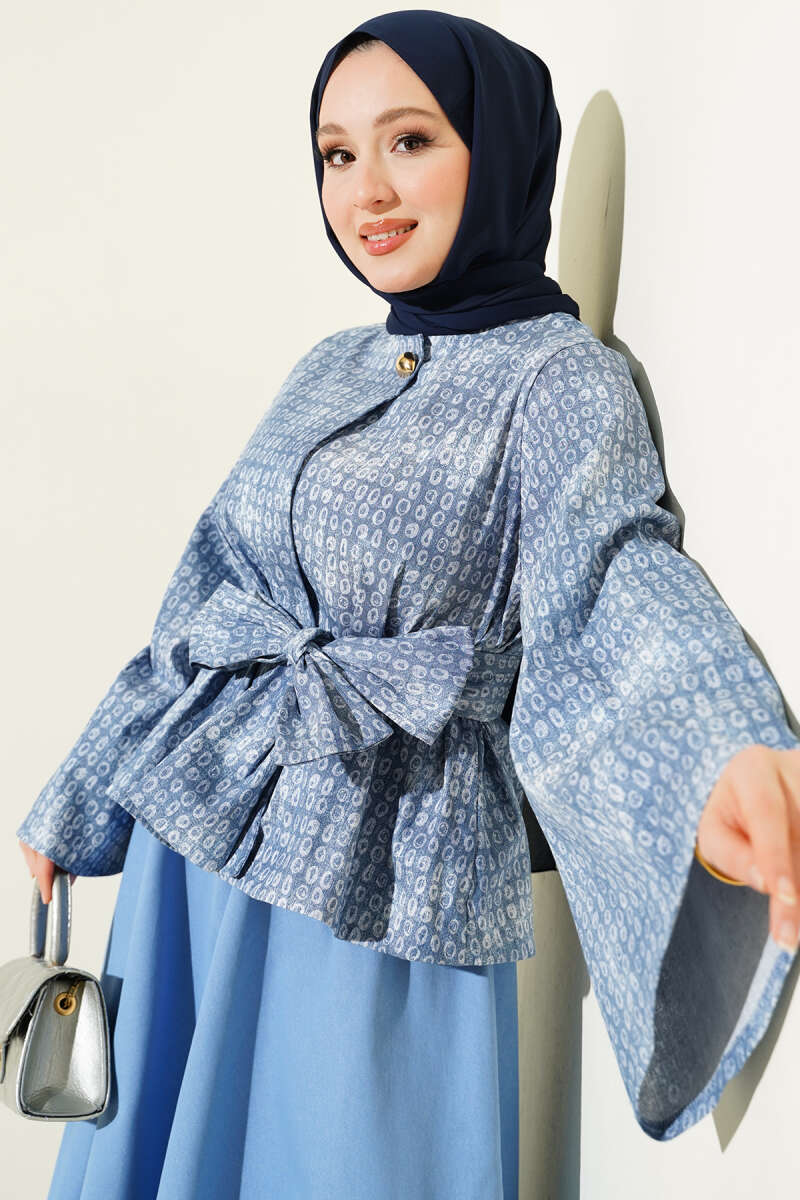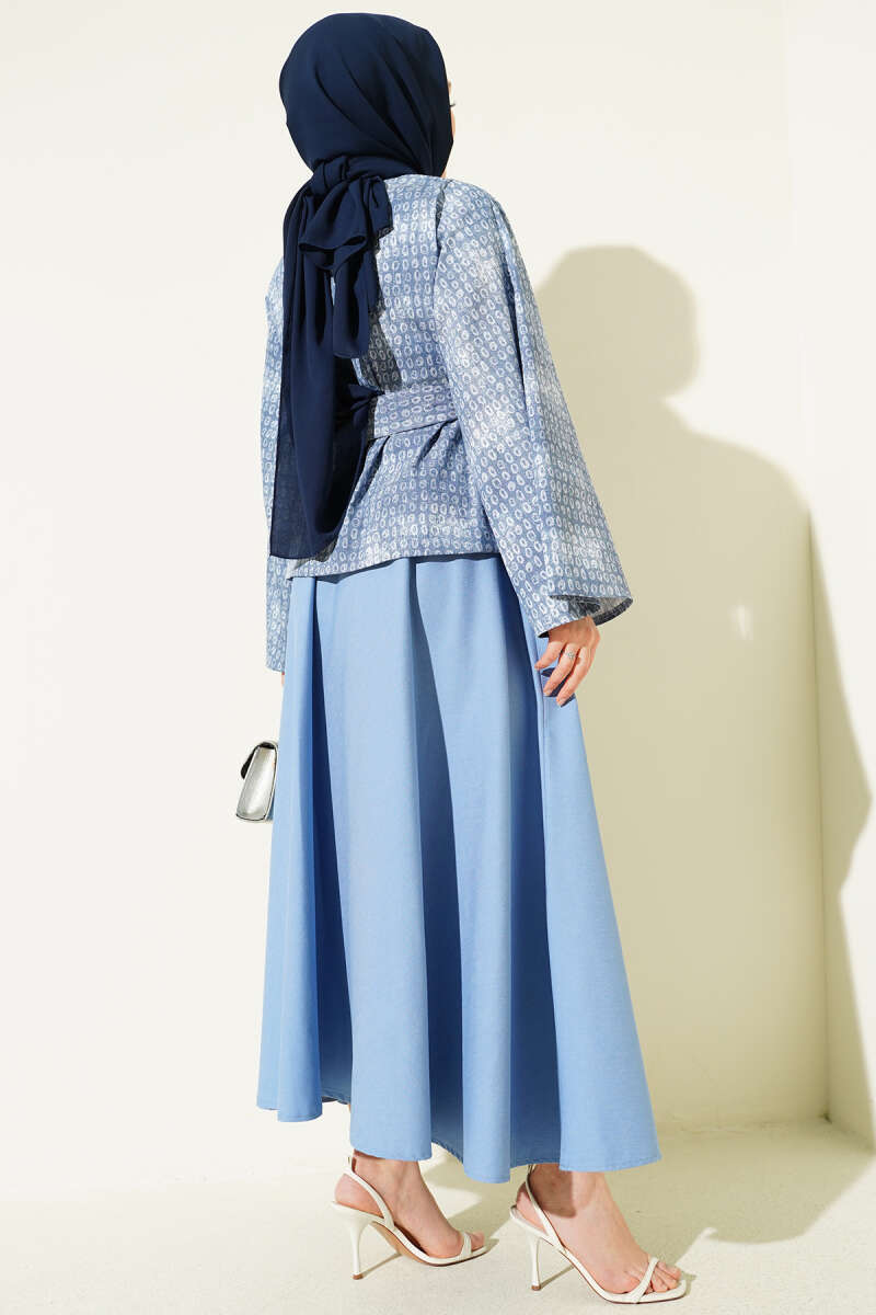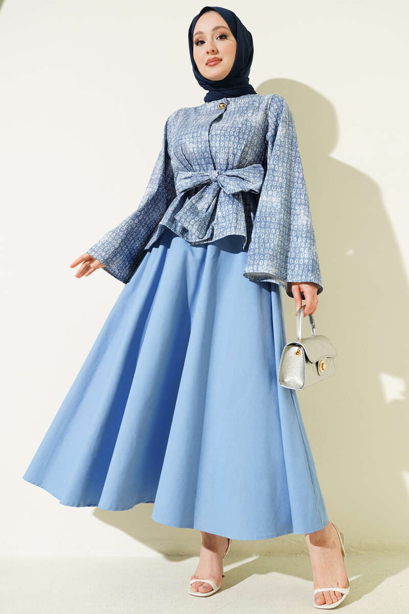 Desenli Kuşaklı Kot Etekli Takım Kot Buz Mavi