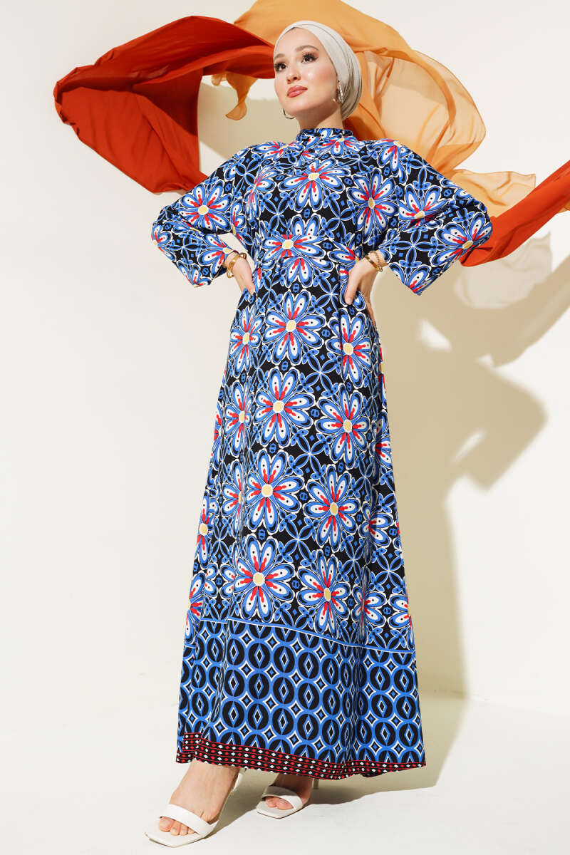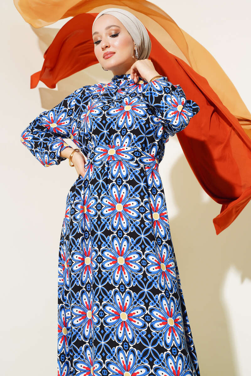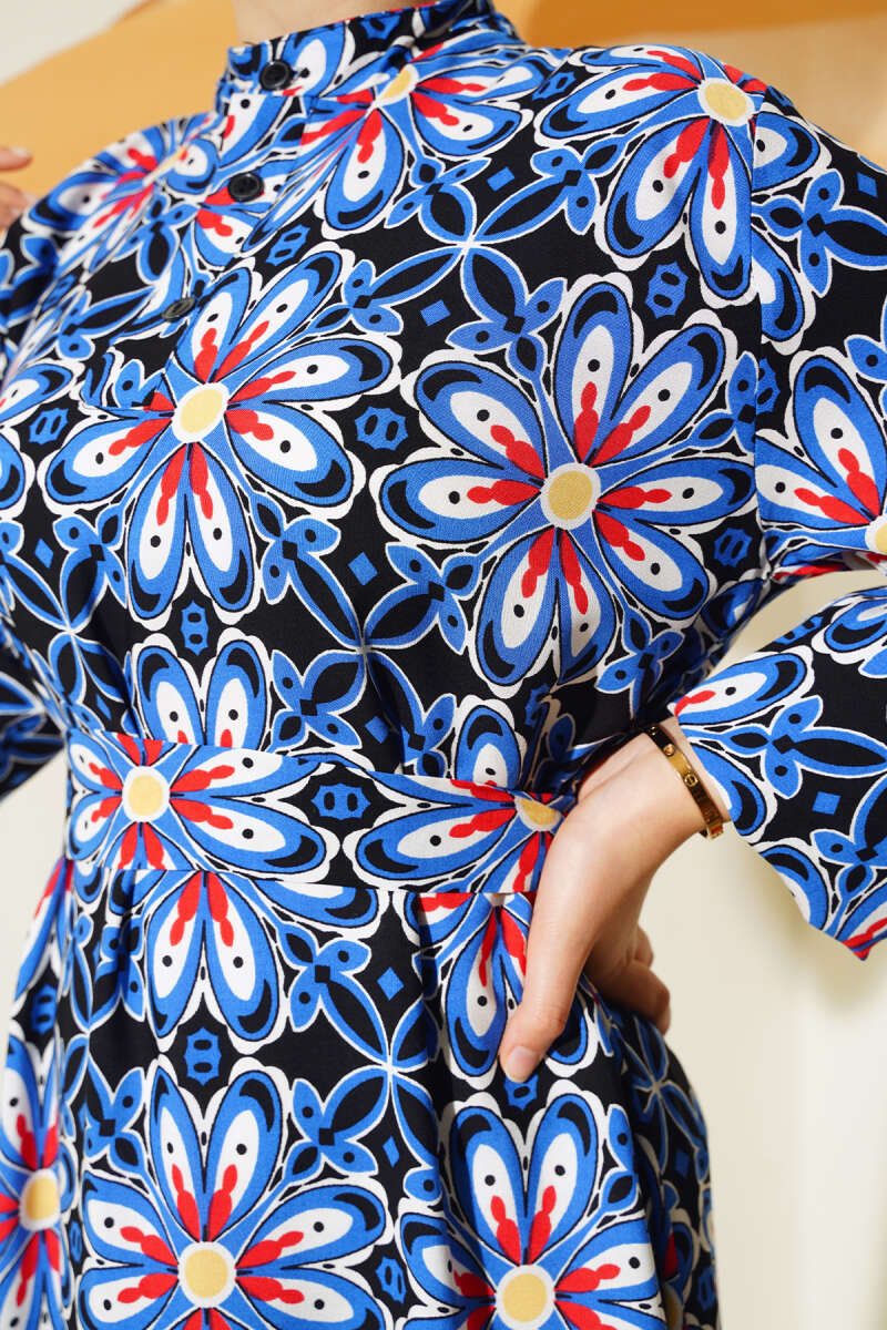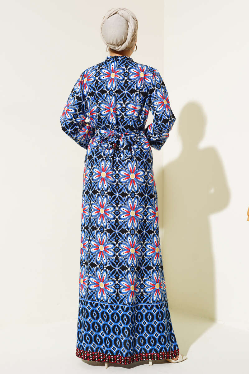 Kolları Boncuk Detaylı Kuşaklı Elbise Lacivert