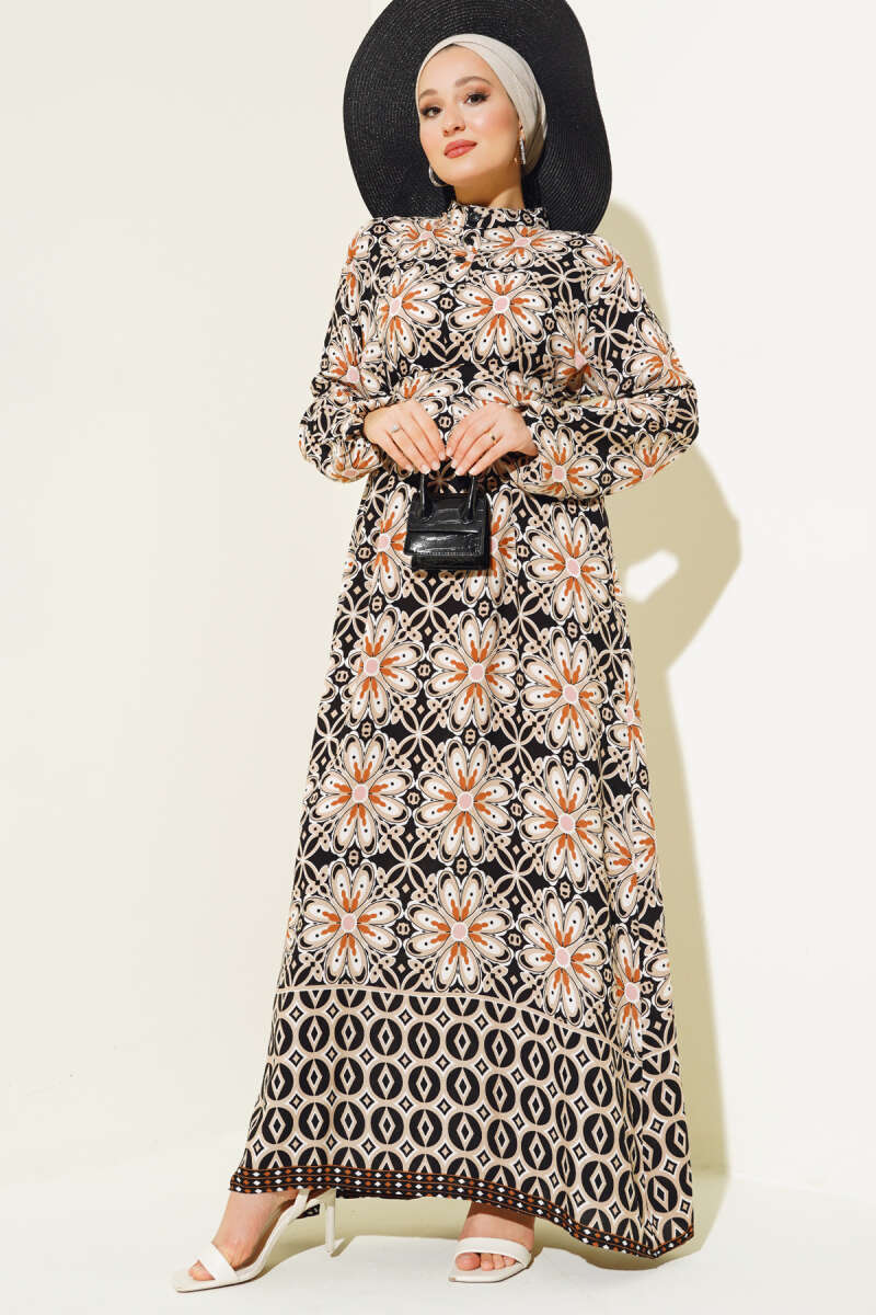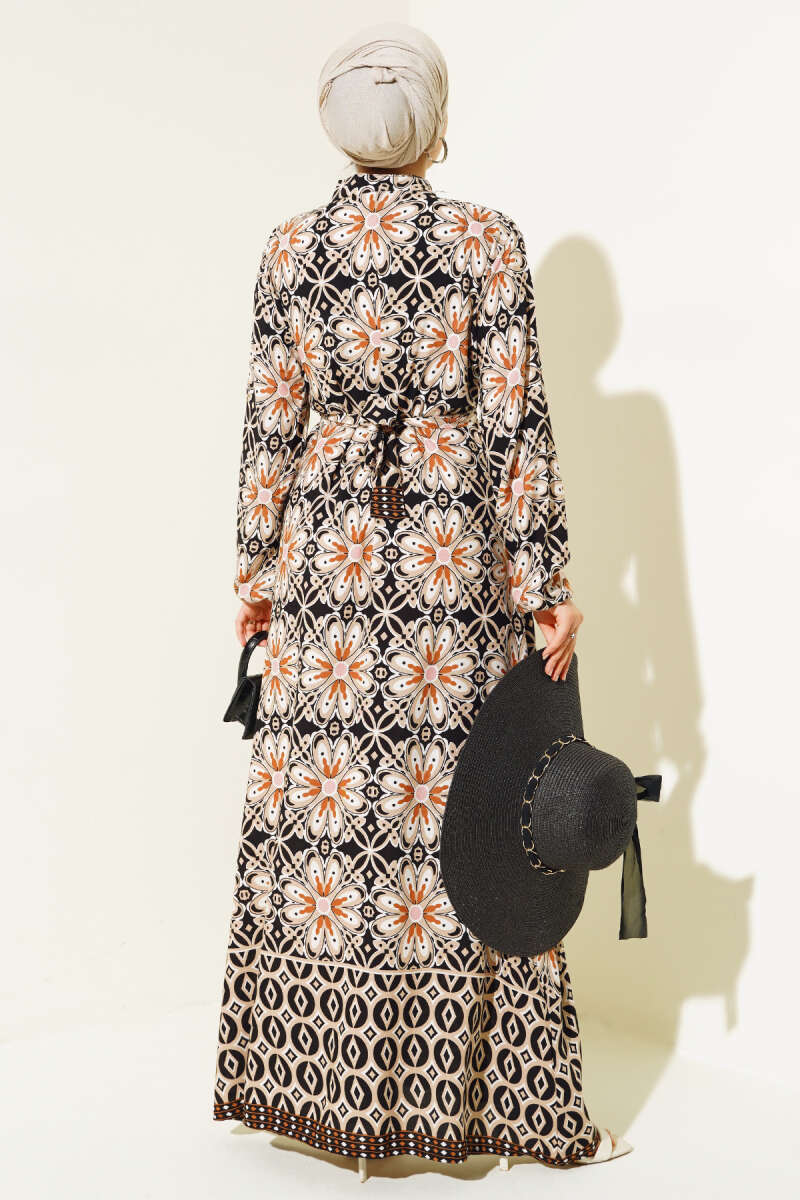 Yarıdan Düğmeli Şifon Elbise Siyah Latte