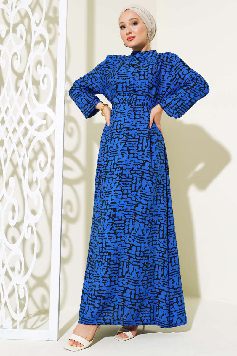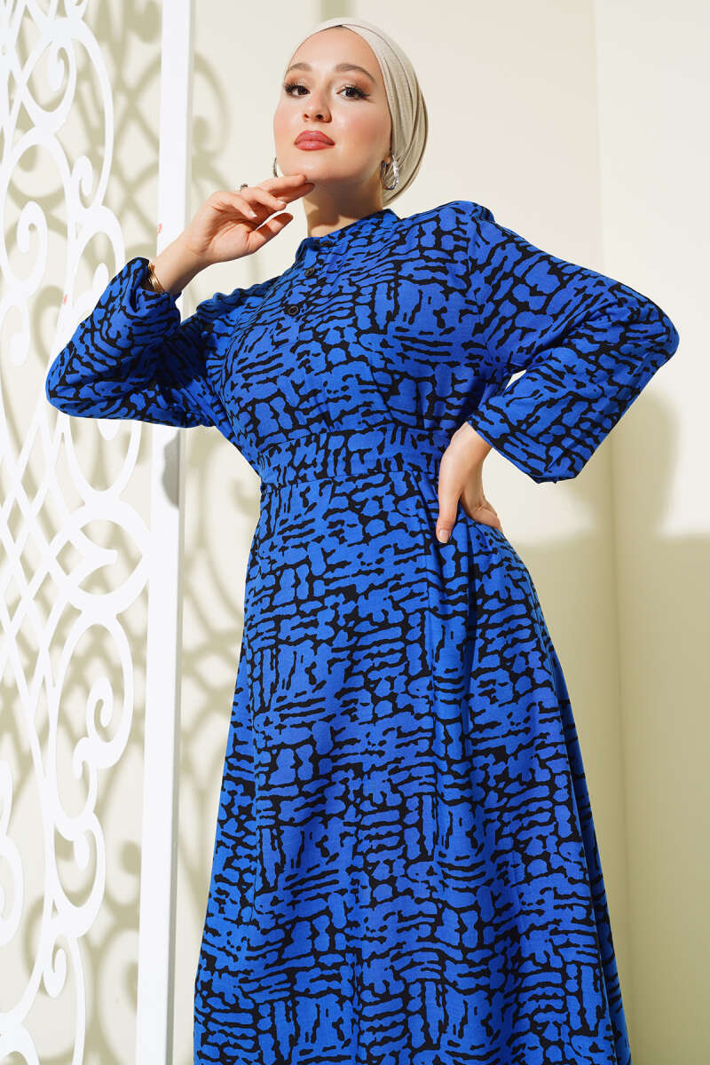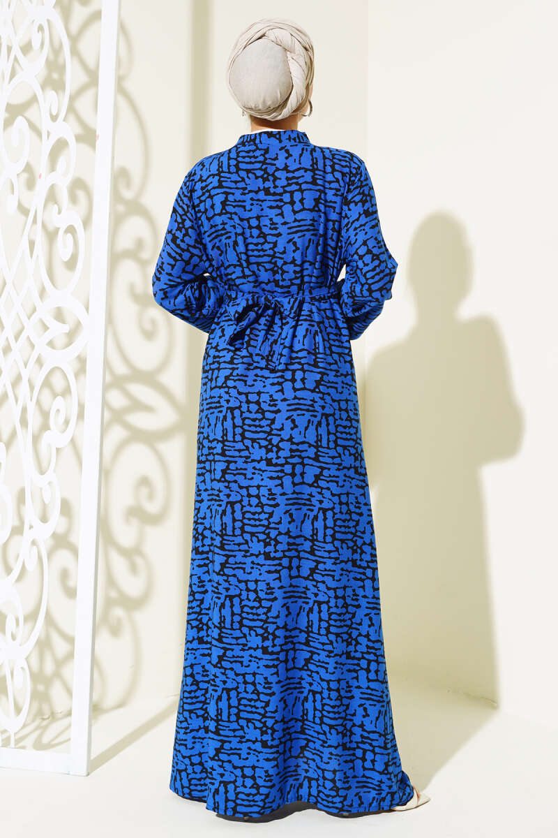 Kolları Boncuk Detaylı Kuşaklı Elbise Lacivert