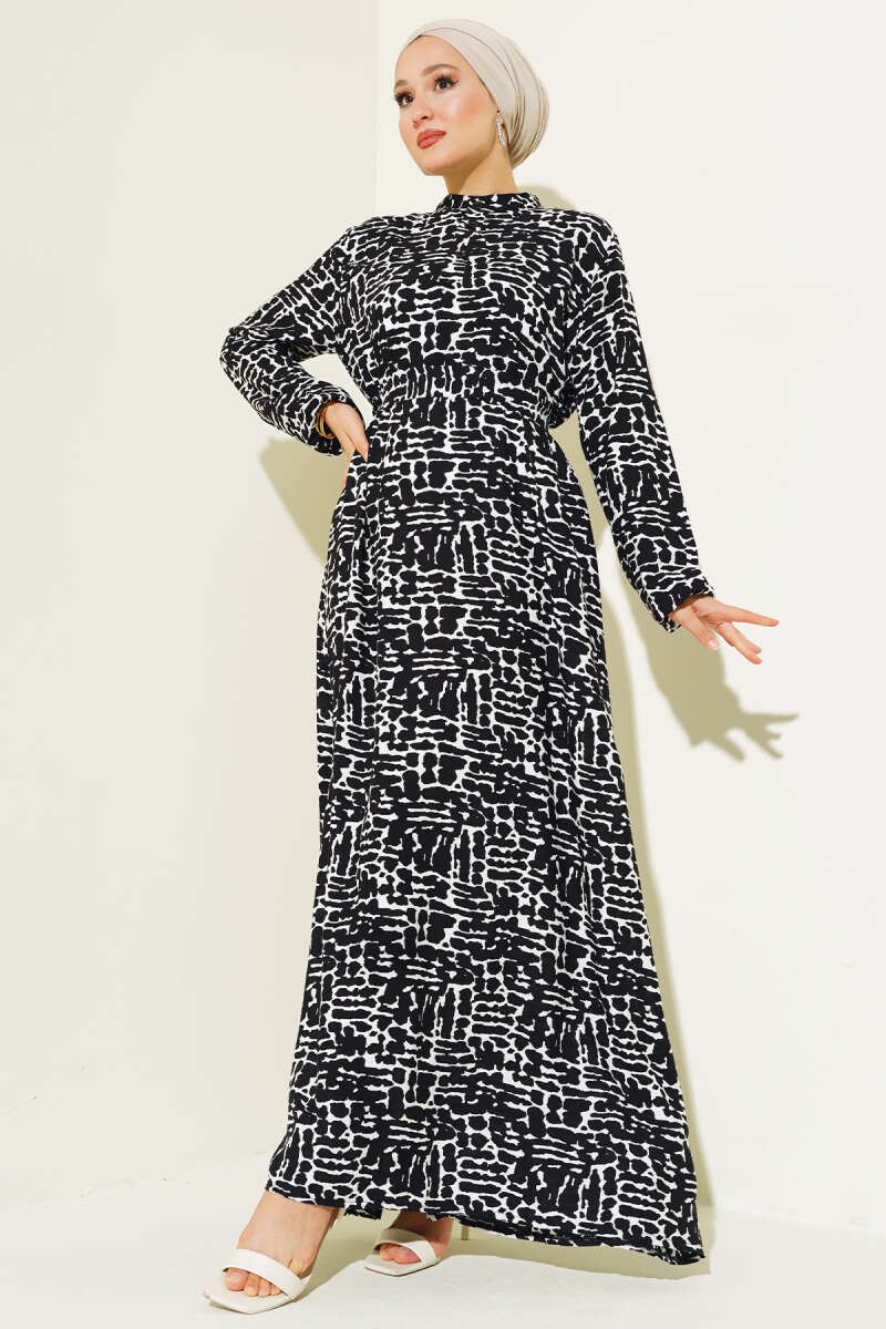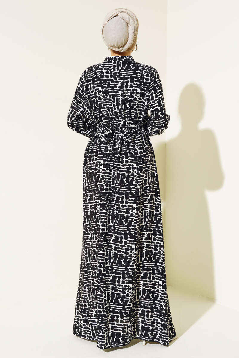 Kolları Boncuk Detaylı Kuşaklı Elbise Fuşya