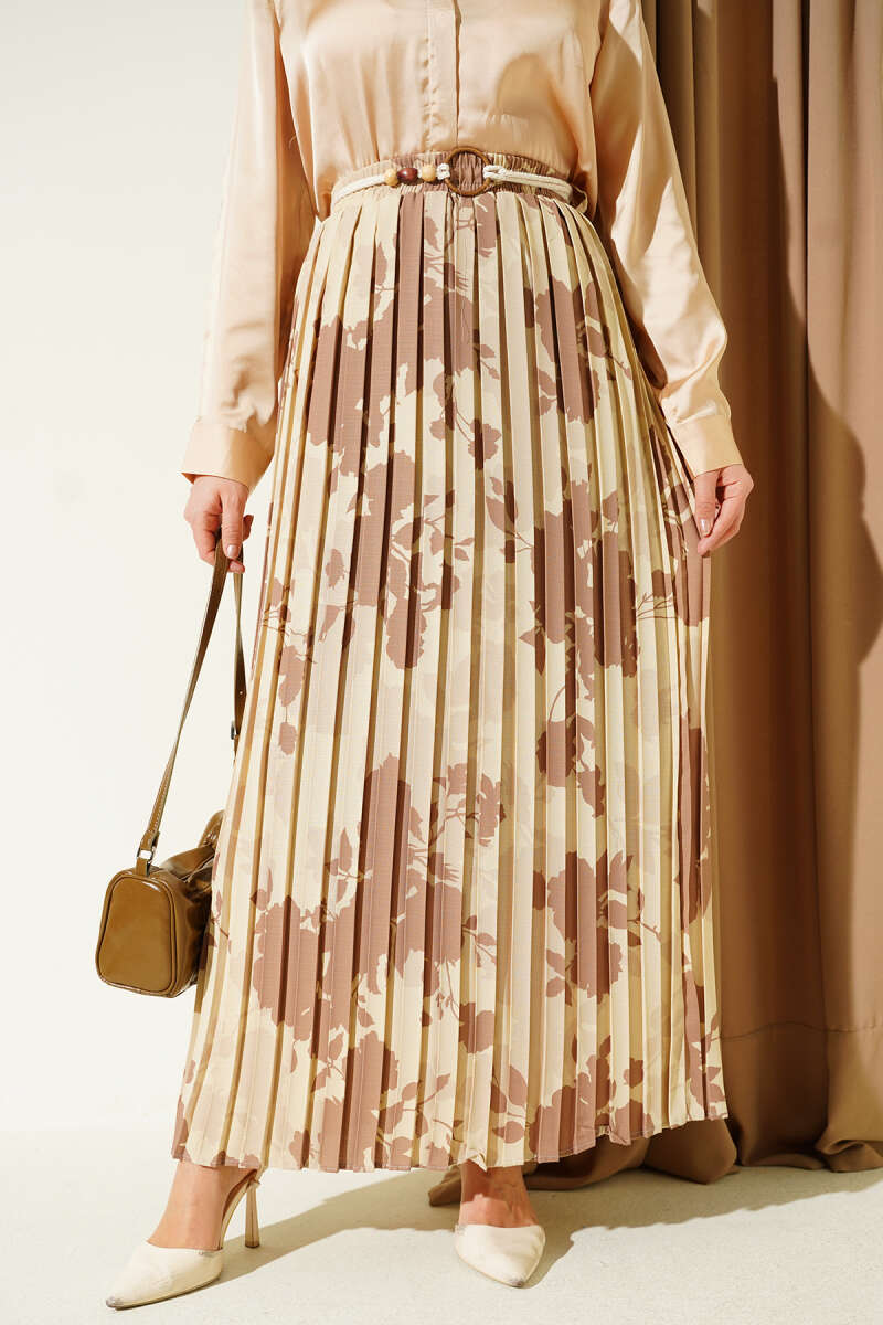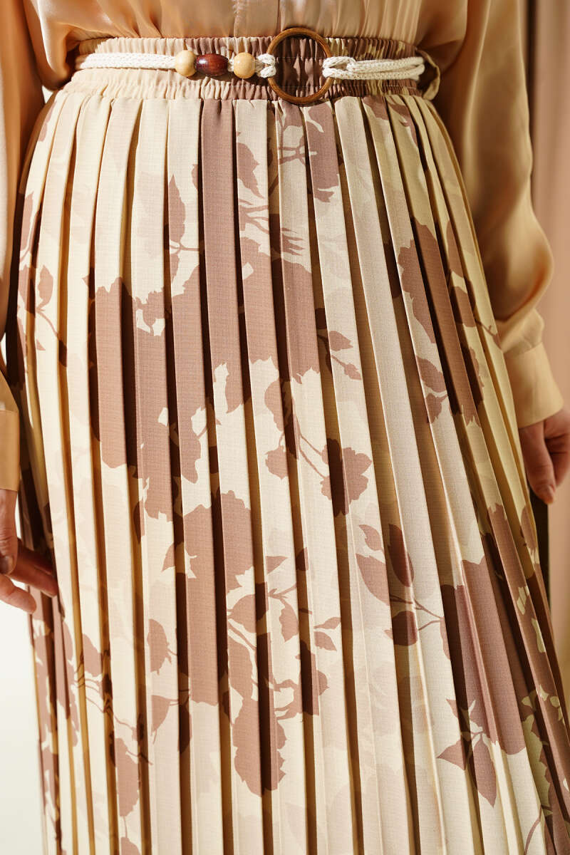 Desenli Pileli Beli Lastikli Etek Bej