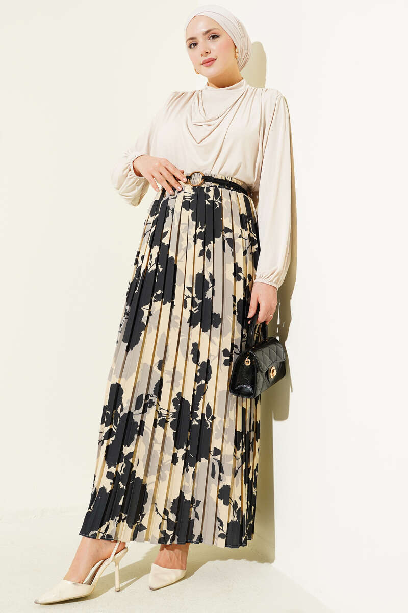 Desenli Pileli Beli Lastikli Etek Siyah