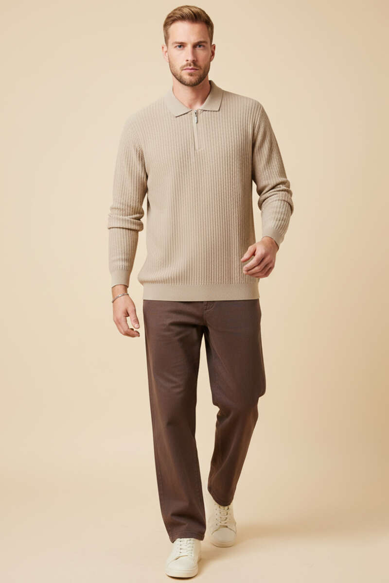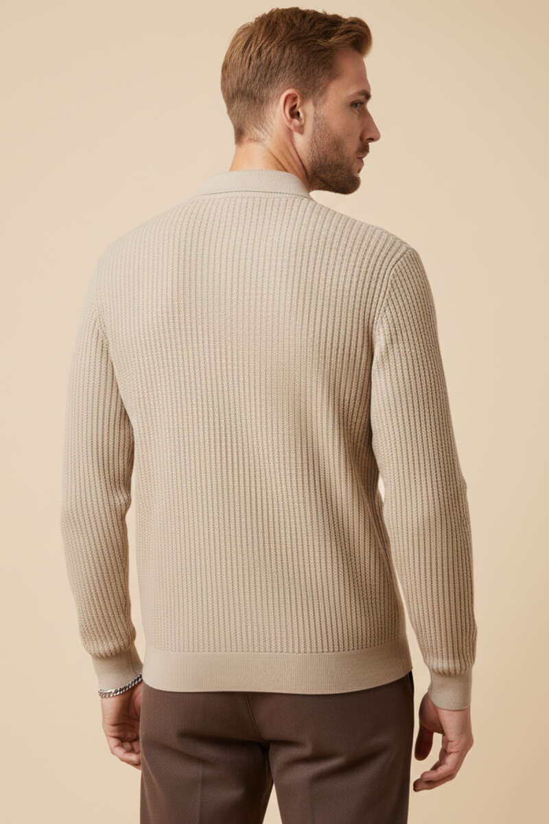 Zincir Desen Örme Triko Erkek Kazak Krem