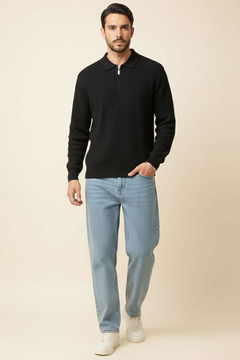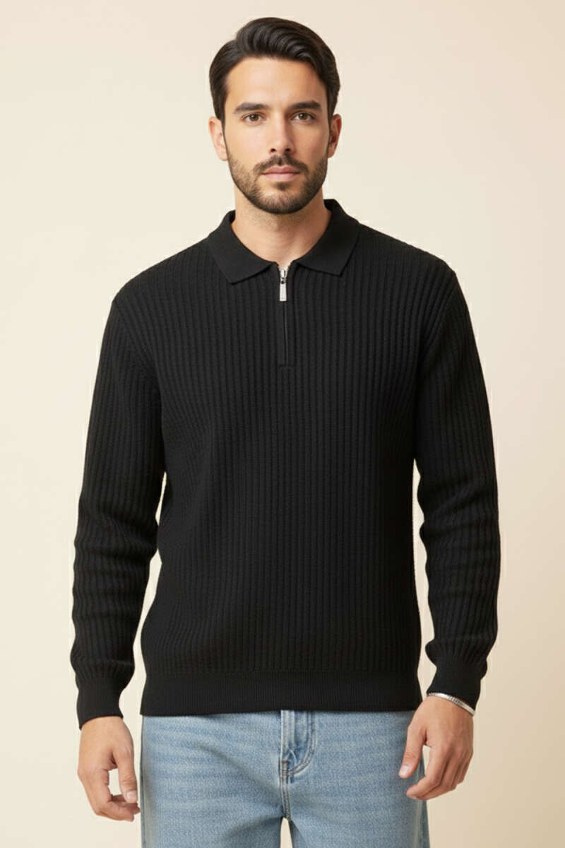 Desenli Polo Yaka Fermuarlı Kazak Siyah