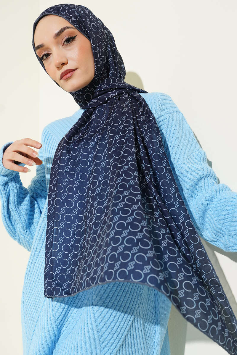 Desenli Ribanalı Demore Şal Lacivert Mavi