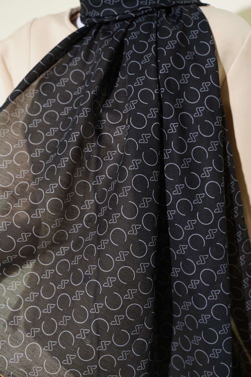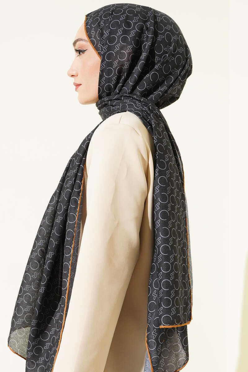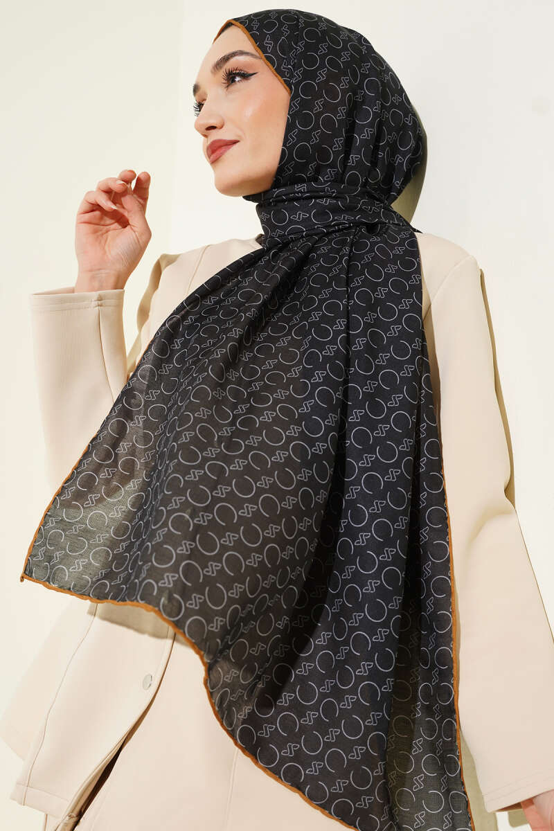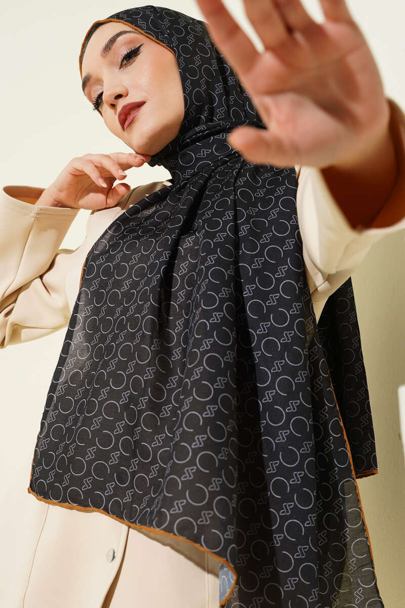 Desenli Ribanalı Demore Şal Siyah Camel