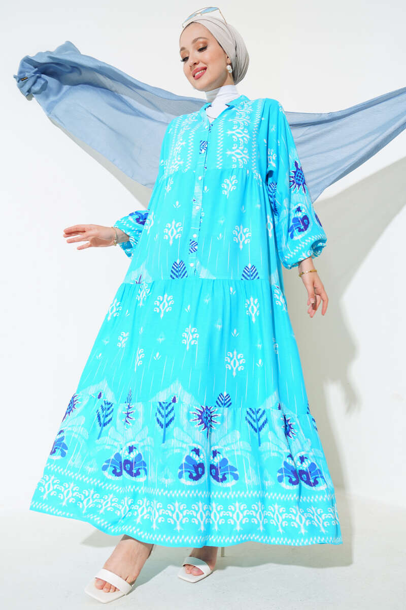 Paisley Desen Bel Lastikli Elbise Lacivert