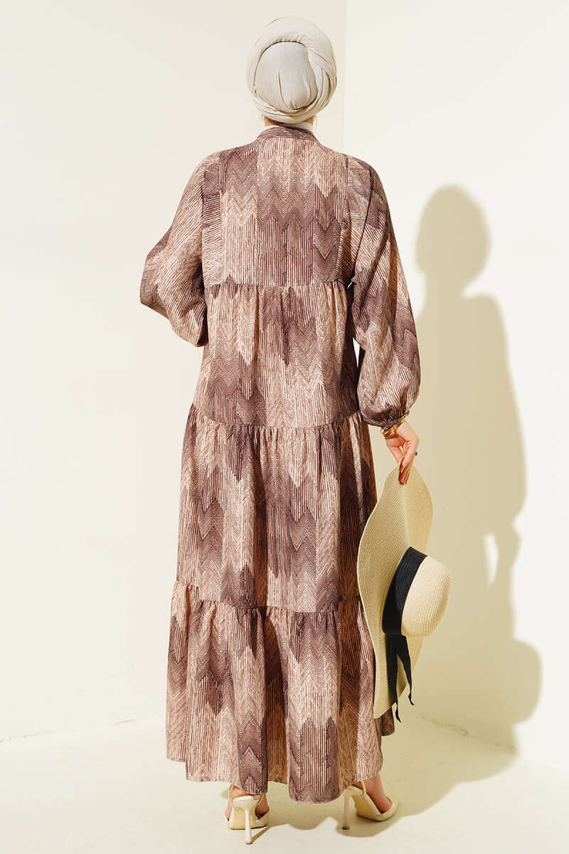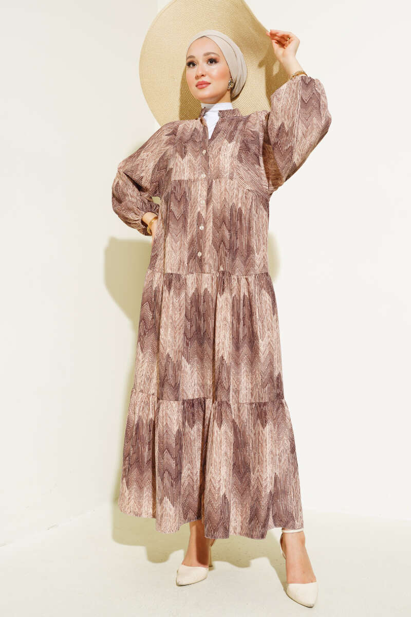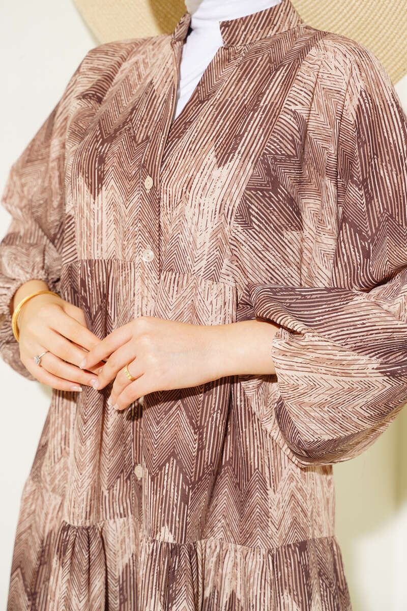 Desenli Salaş Yarım Düğmeli Elbise Vizon