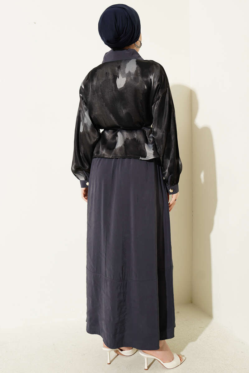 Desenli Saten Bluz Etekli İkili Takım Füme