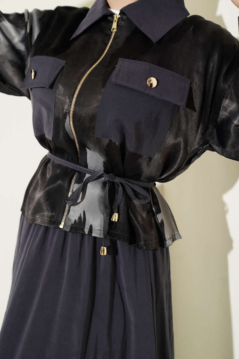 • Saten Işıltısı ve Modern Kesim: Desenli saten üst parçanın şık parıltısı, beli bağcıklı ve fermuar detaylı tasarımıyla birleşerek silüetinize modern bir derinlik katar.