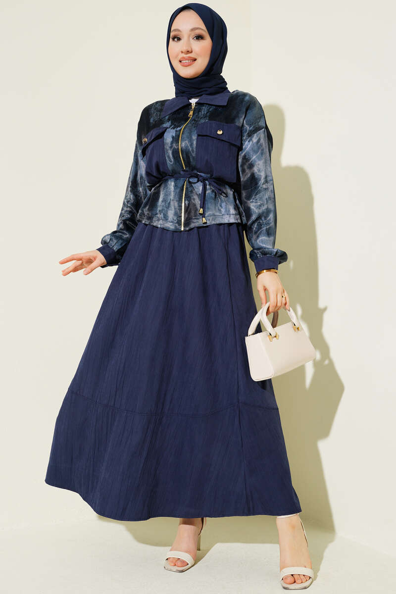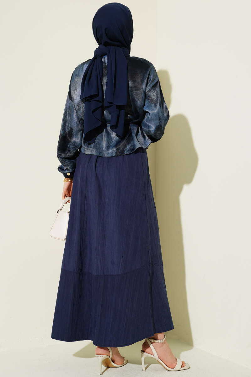 Desenli Saten Bluz Etekli İkili Takım Lacivert