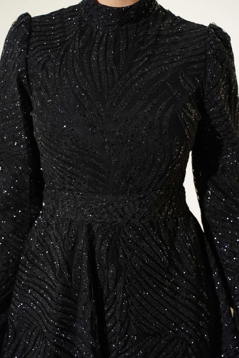 Desenli Simli Pullu Abiye Elbise Lacivert