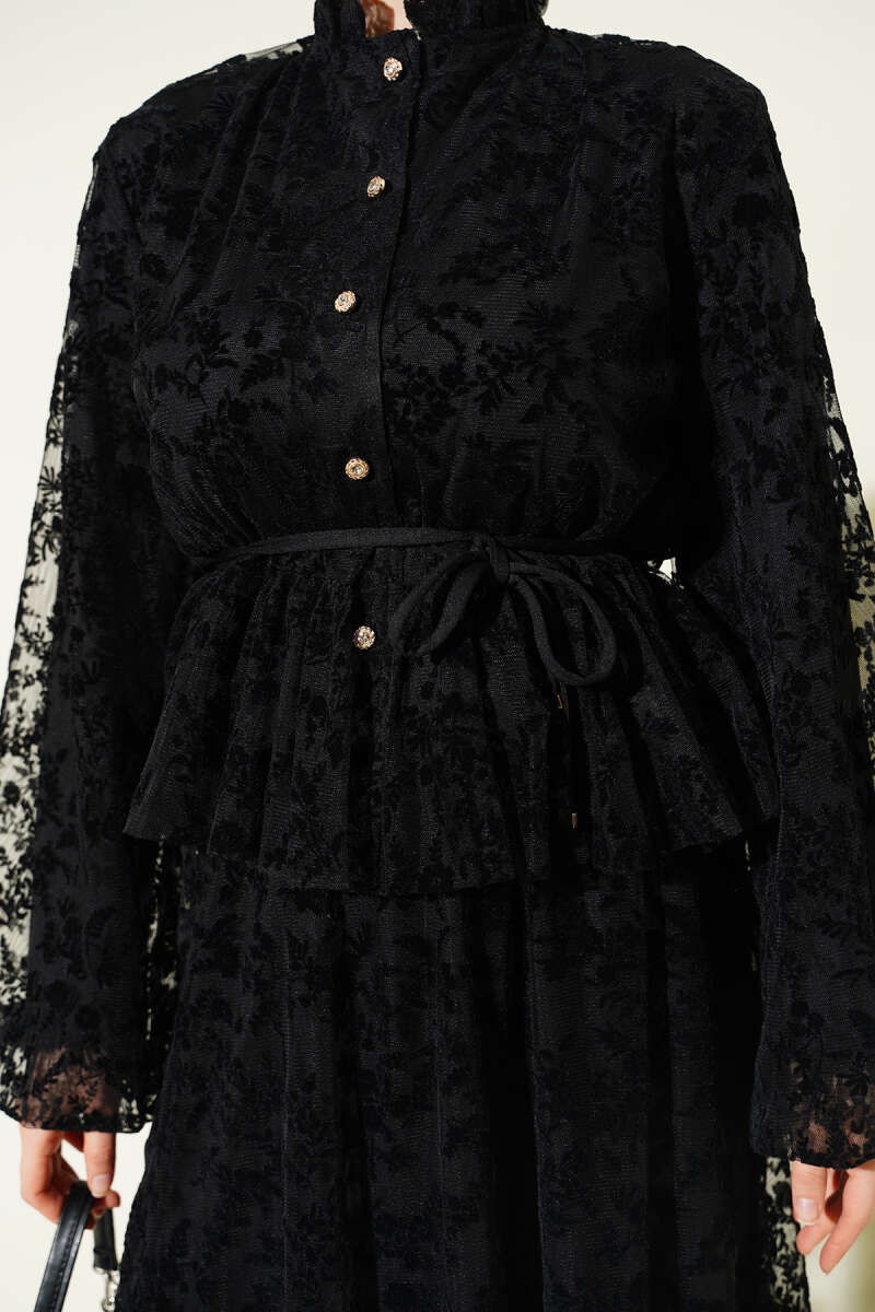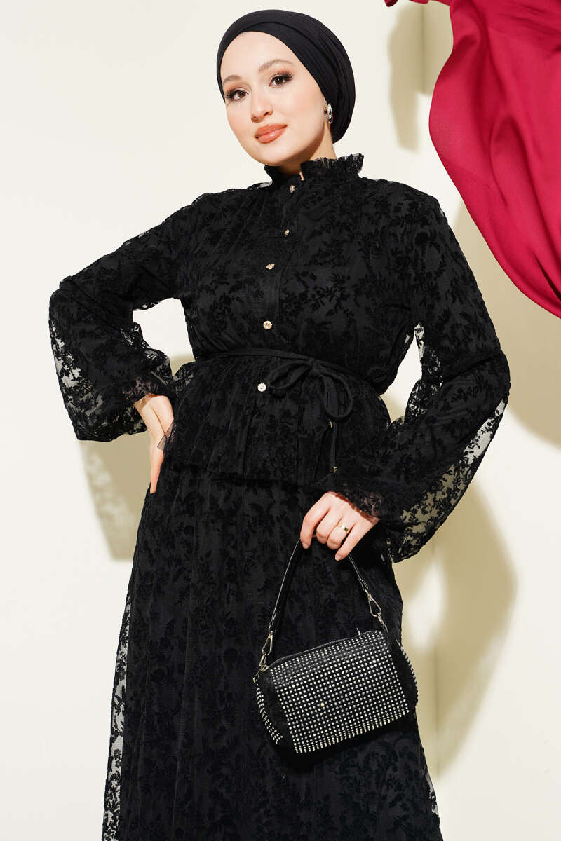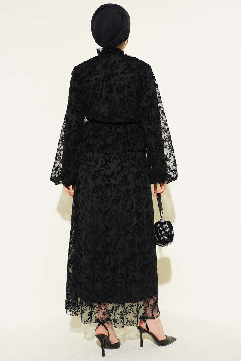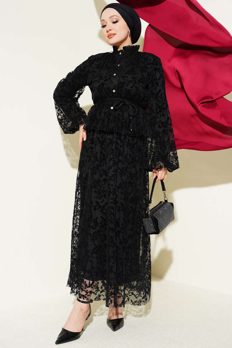Desenli Tül Etekli Siyah
