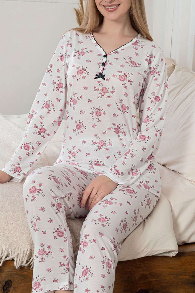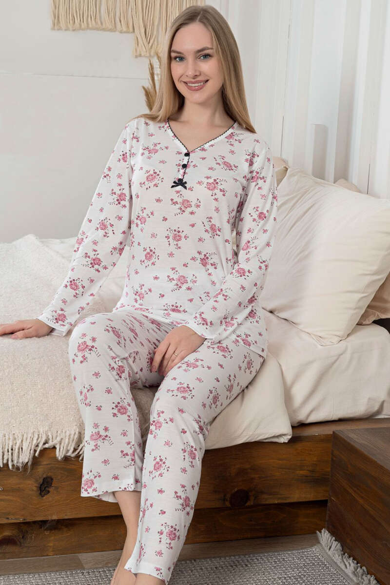 Desenli Üç Düğmeli Viskon Pijama Takımı Gül Kurusu