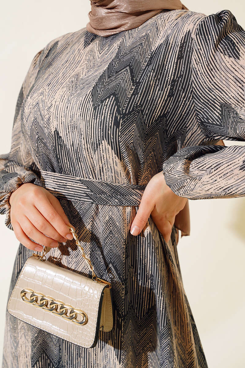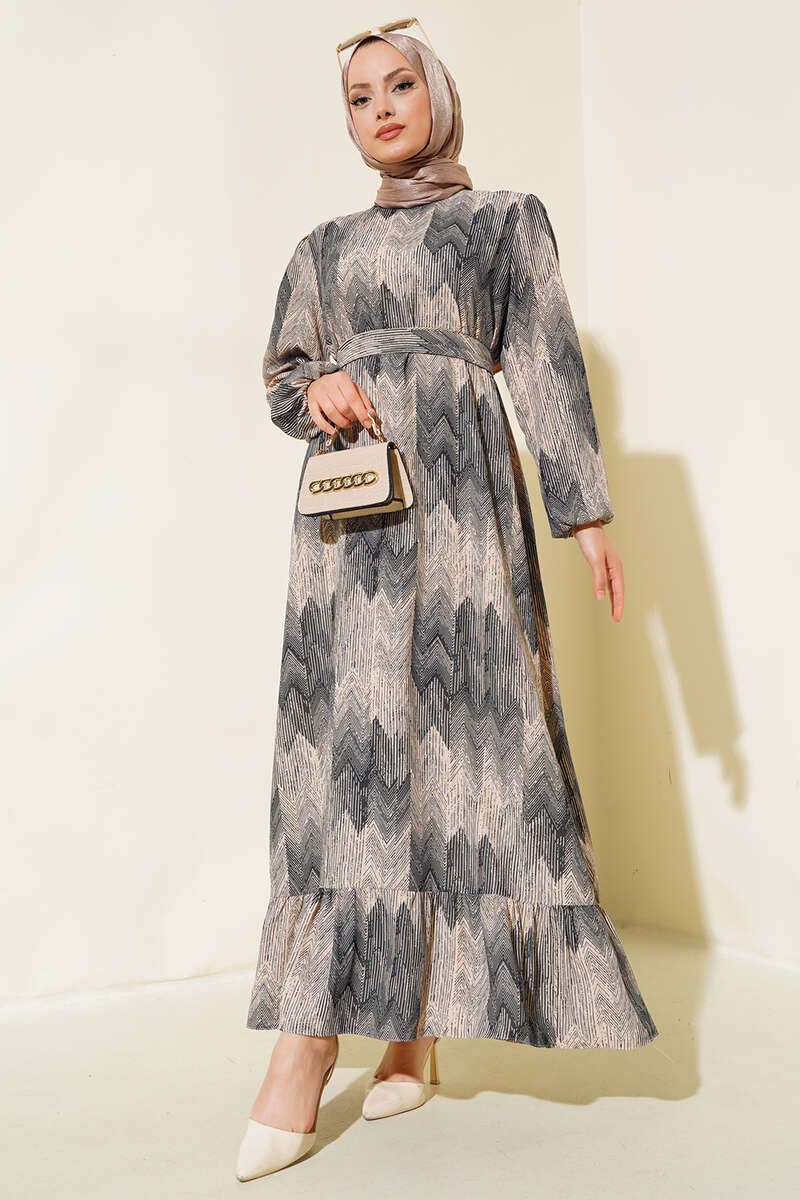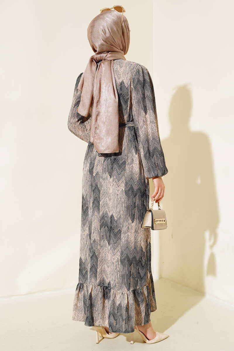 Desenli Viscon Elbise Siyah