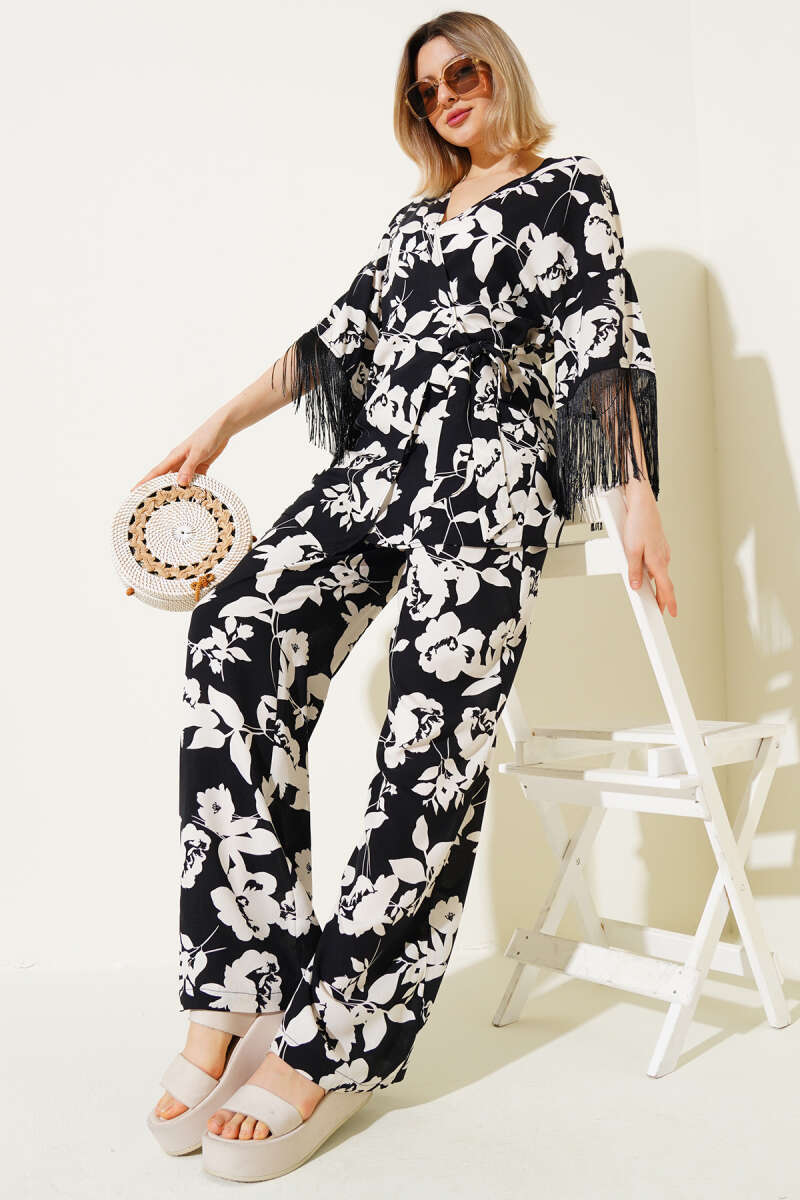 Desenli Yandan Bağlamalı Püsküllü Viskon İkili Takım Siyah
