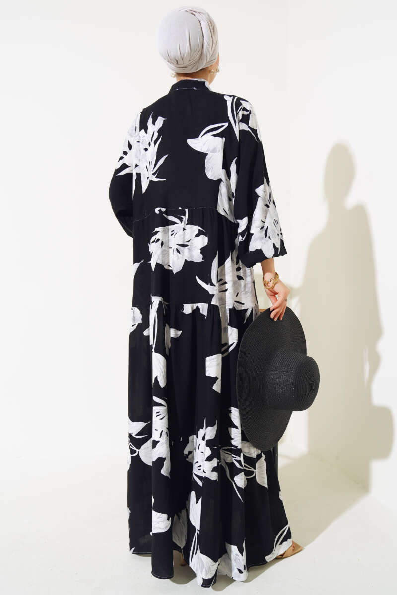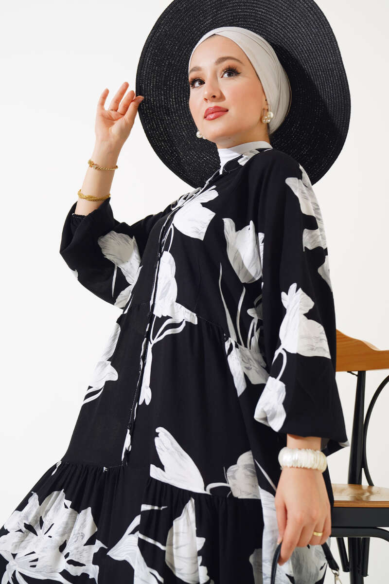 Desenli Yarasa Kol Viskon Elbise Siyah Beyaz