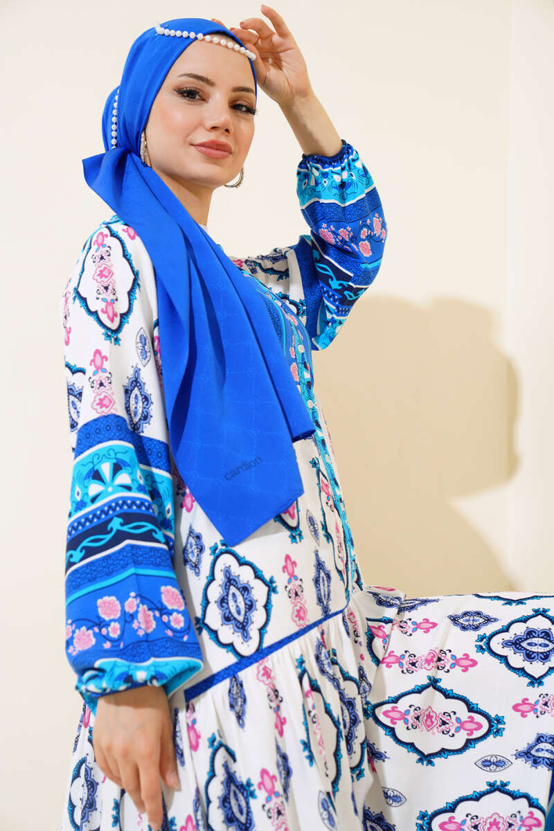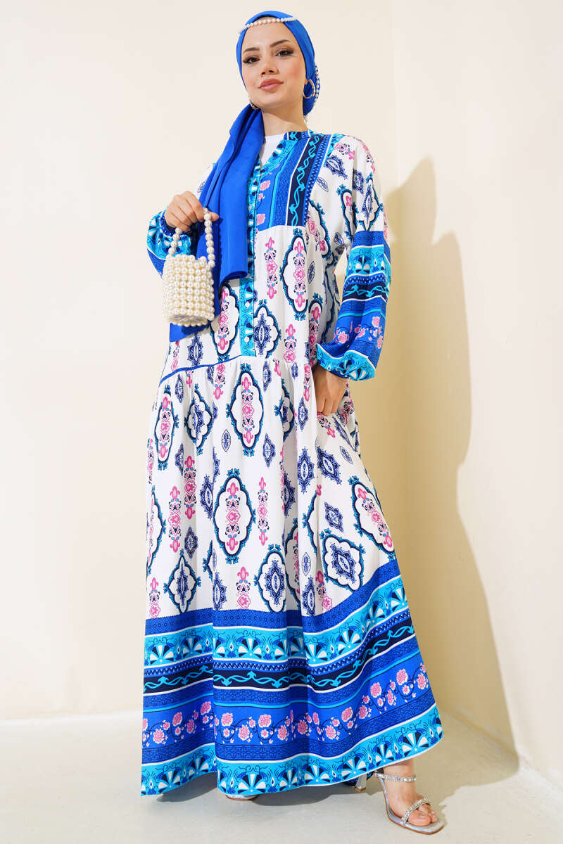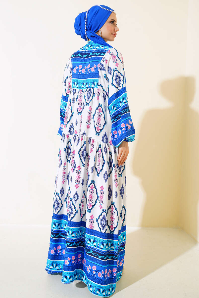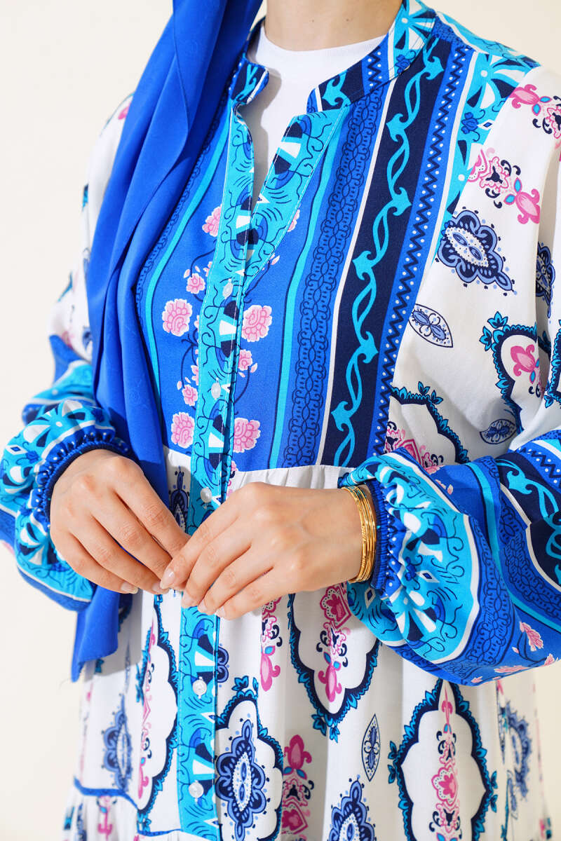 Desenli Yarım Düğmeli Elbise Beyaz Saks