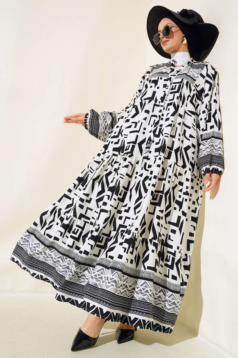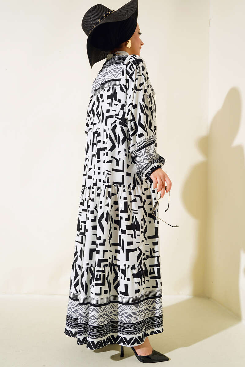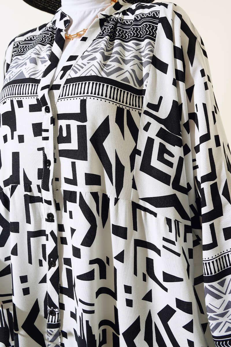 Desenli Yarım Düğmeli Salaş Elbise Beyaz
