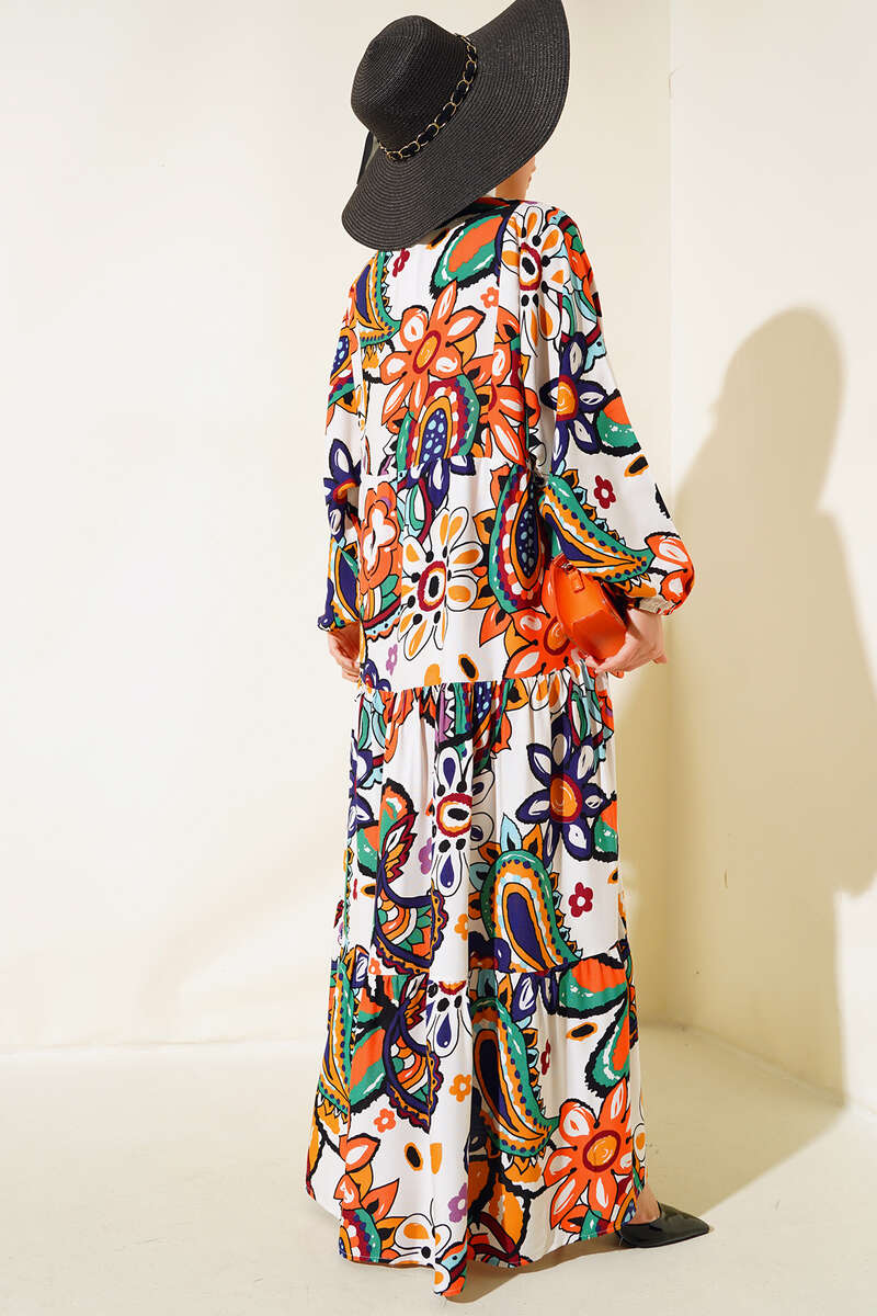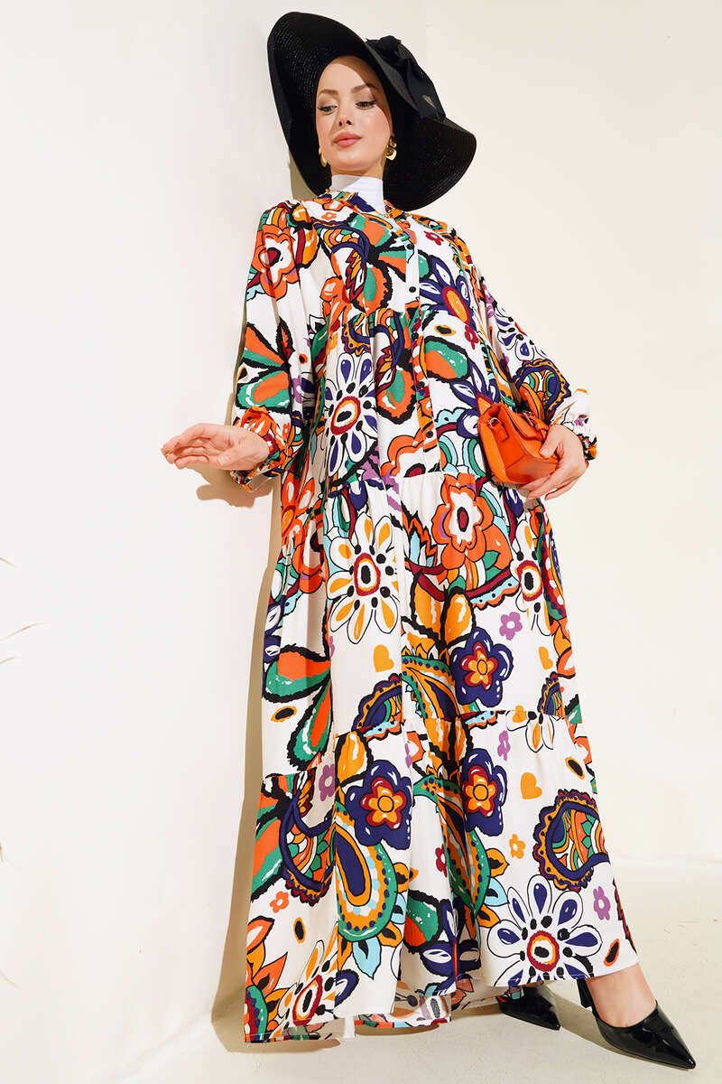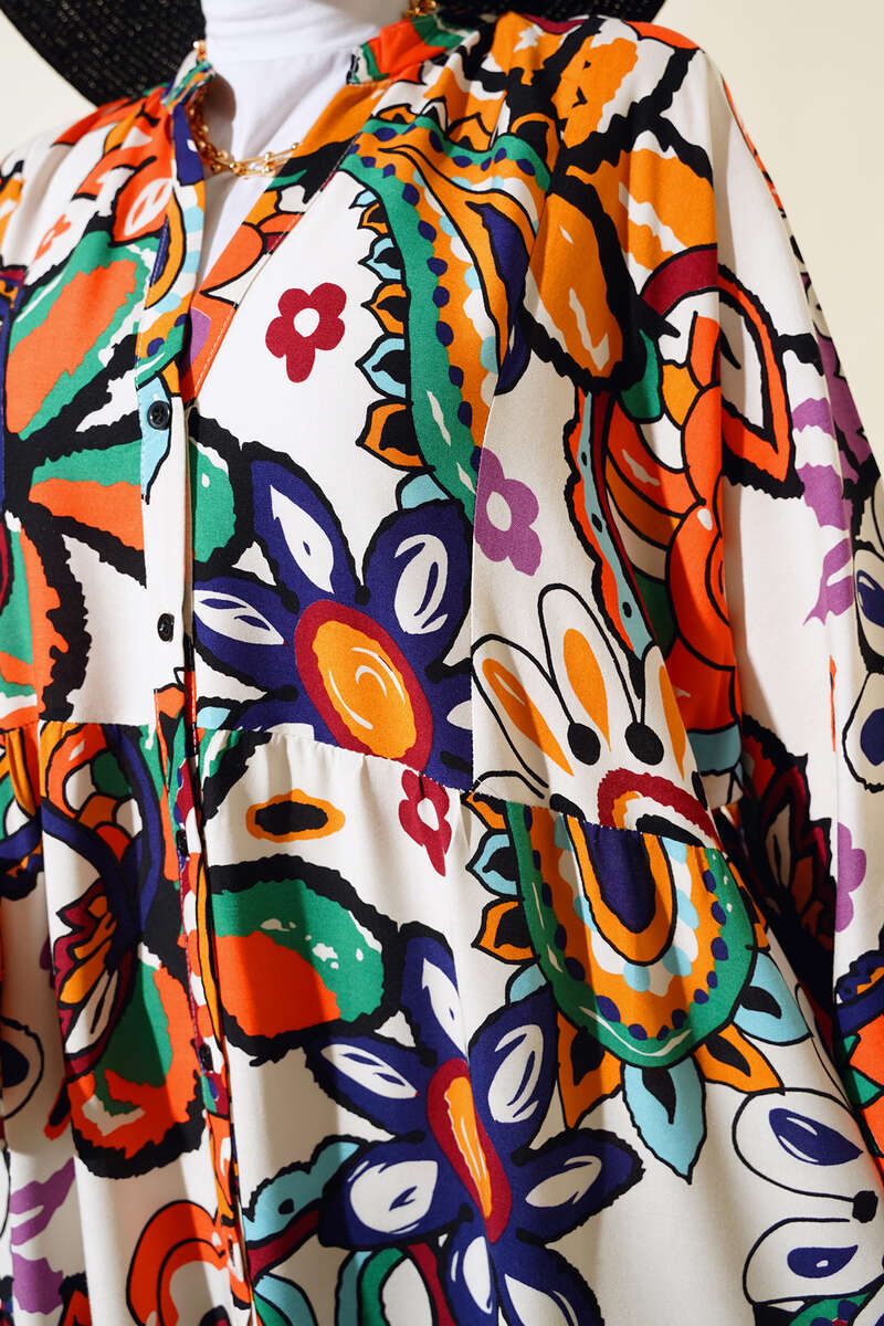 Desenli Yarım Düğmeli Salaş Elbise Gökkuşağı