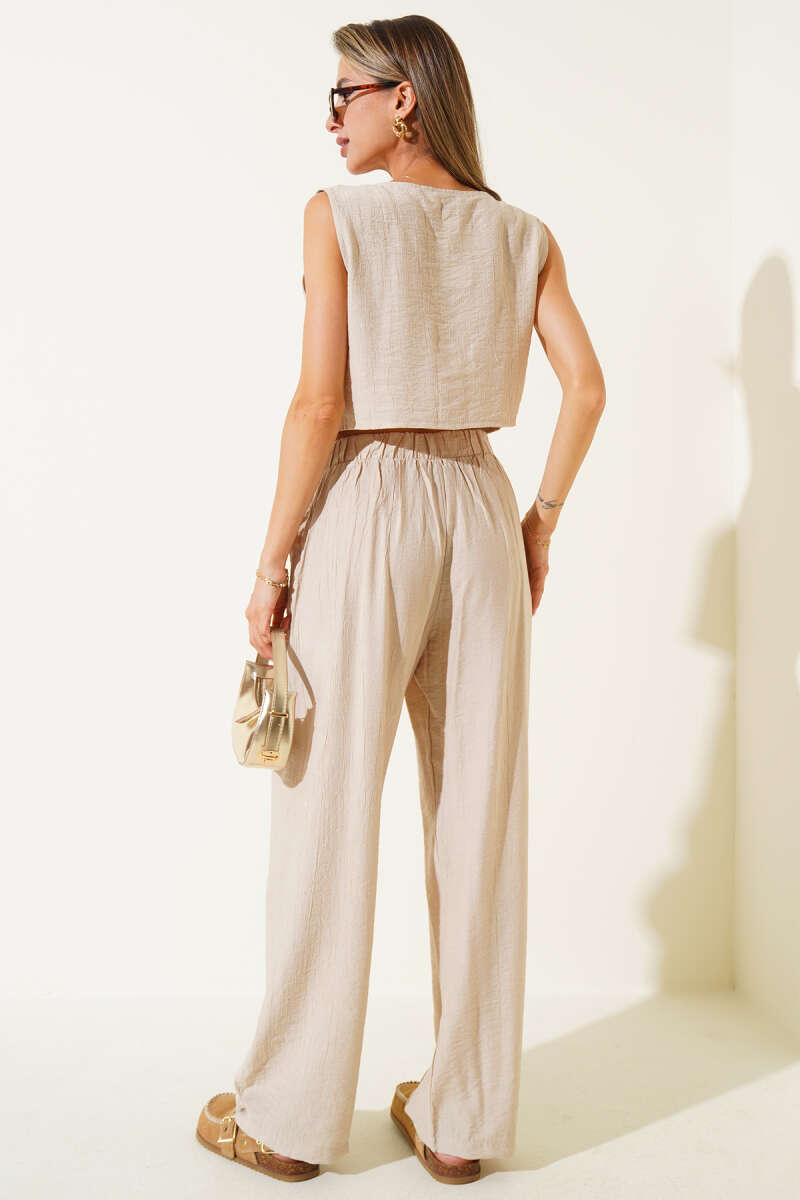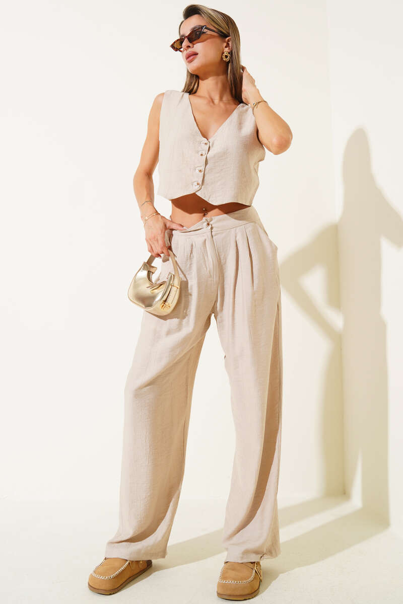 Kolsuz Düğmeli Yelekli İkili Takım Bej