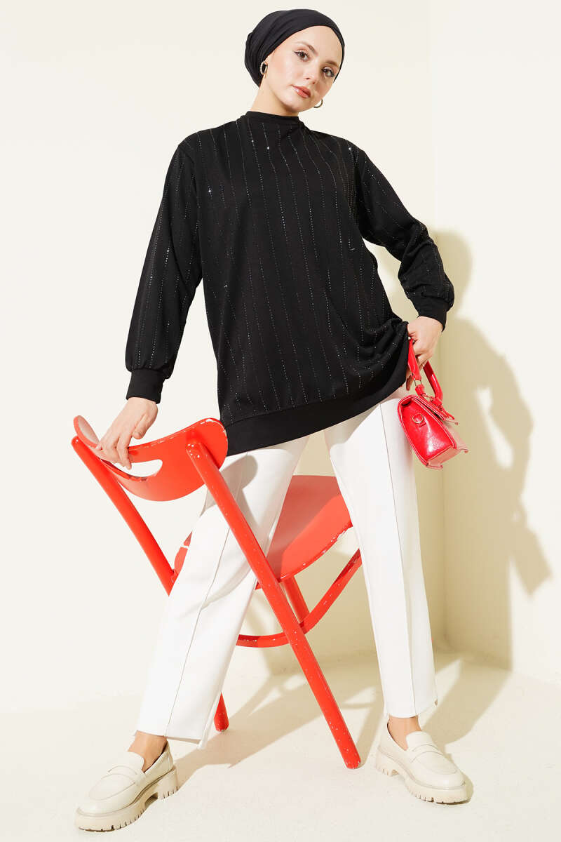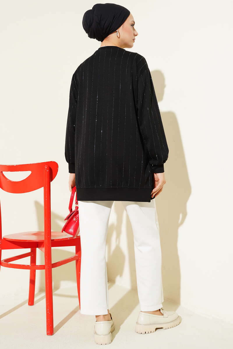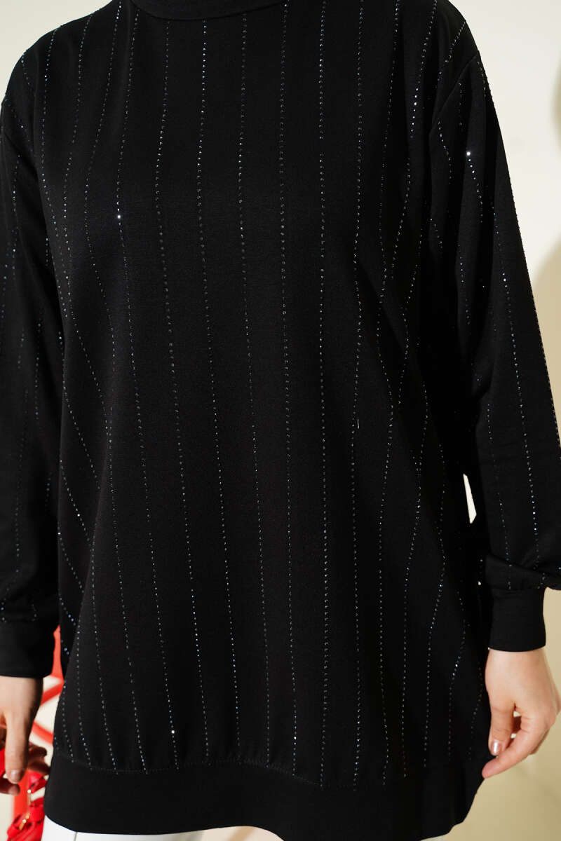 Dik Şerit Taşlı Loyşa Tunik Siyah