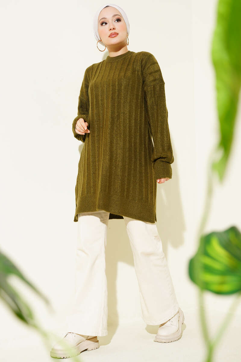 Dik Çizgi Kabartmalı Triko Tunik Vizon
