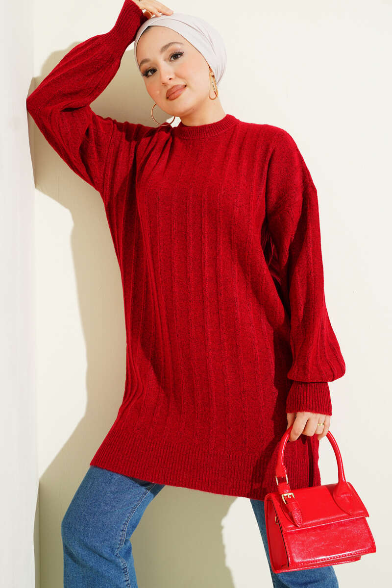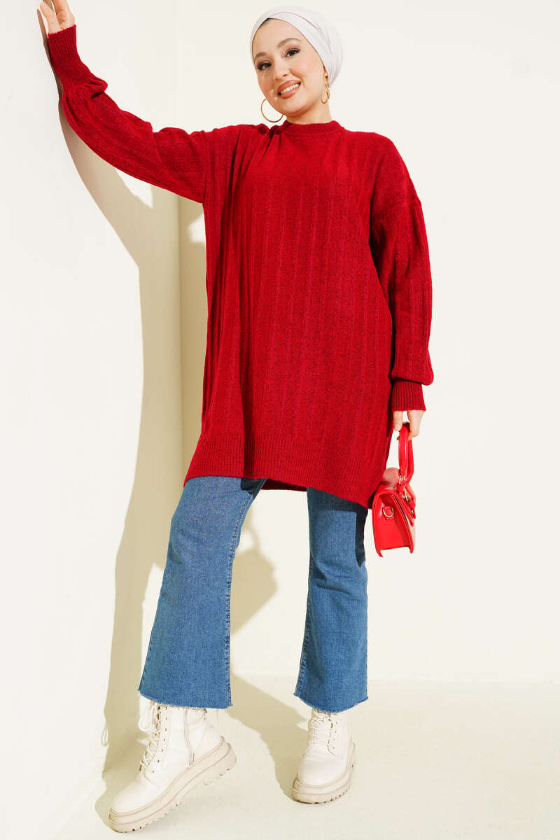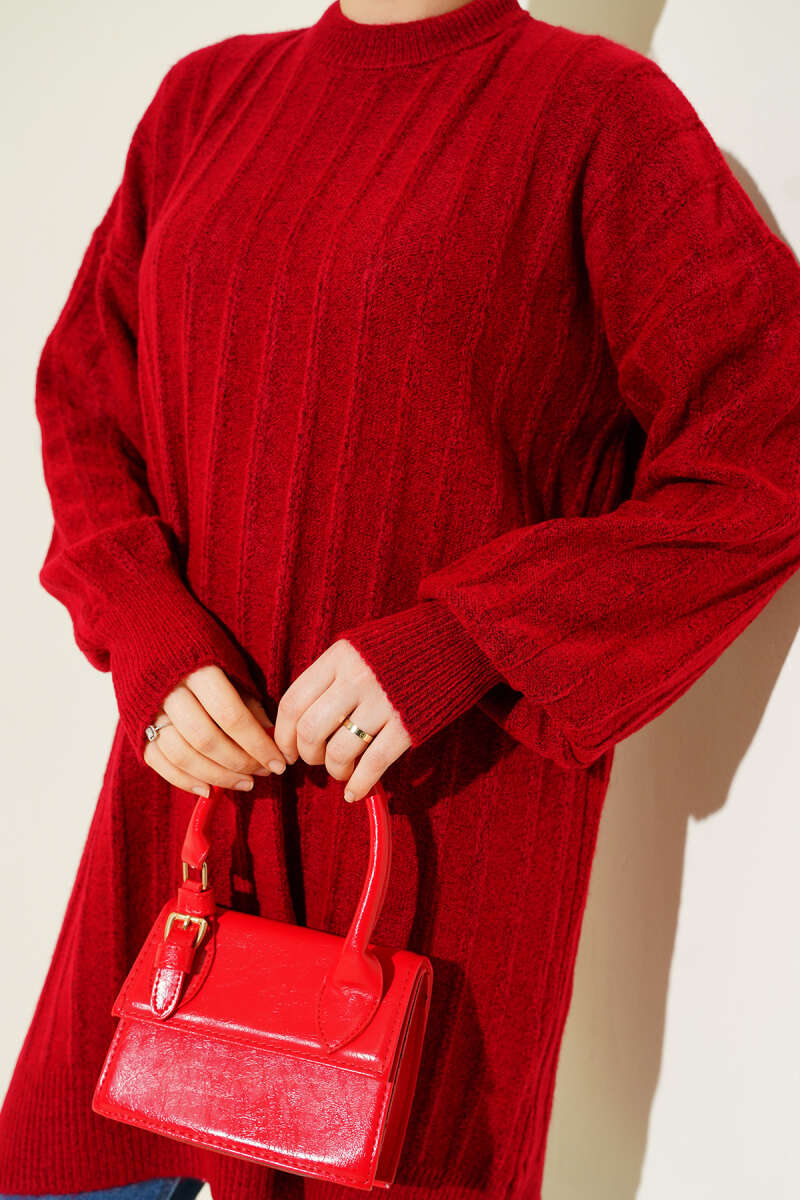 Dik Çizgi Kabartmalı Triko Tunik Bordo