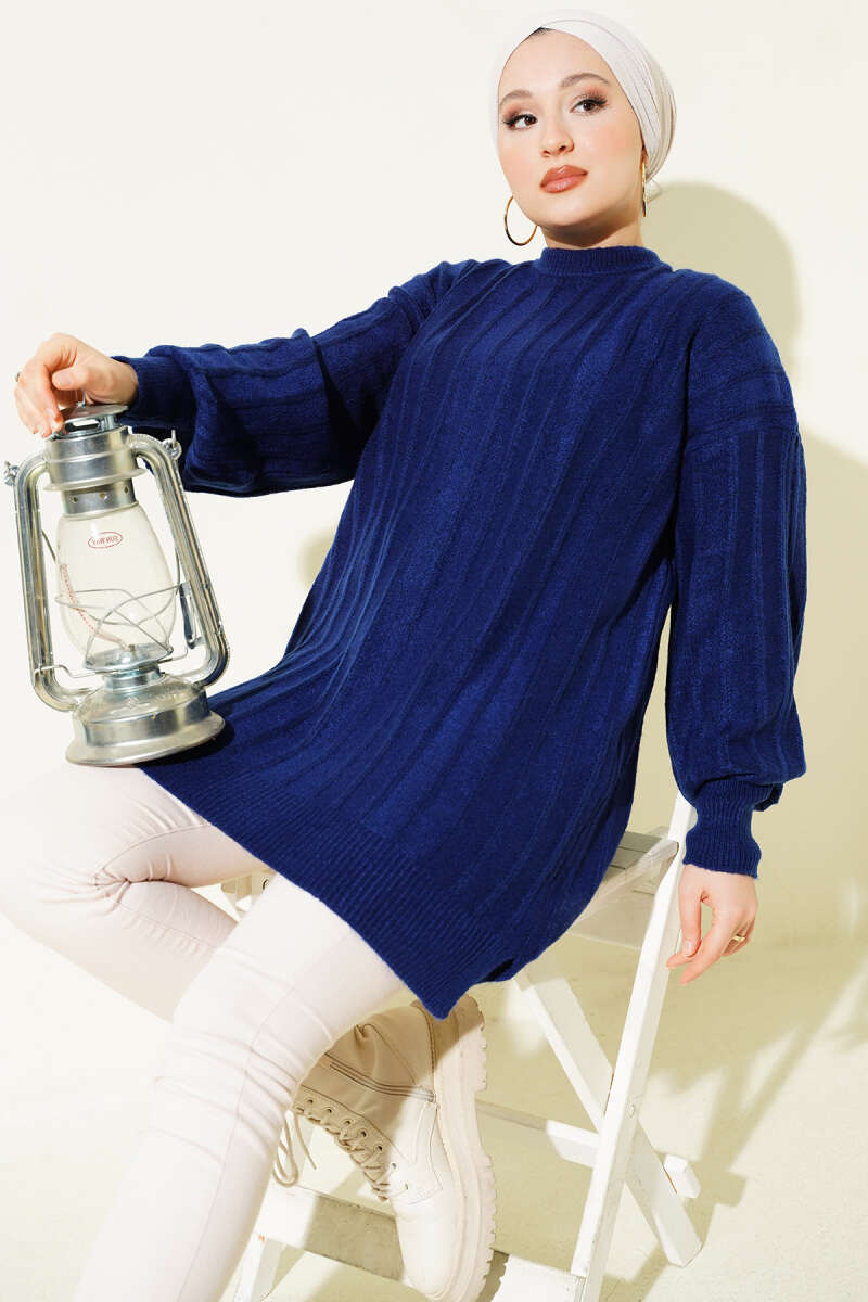 Dik Çizgi Kabartmalı Triko Tunik Zümrüt
