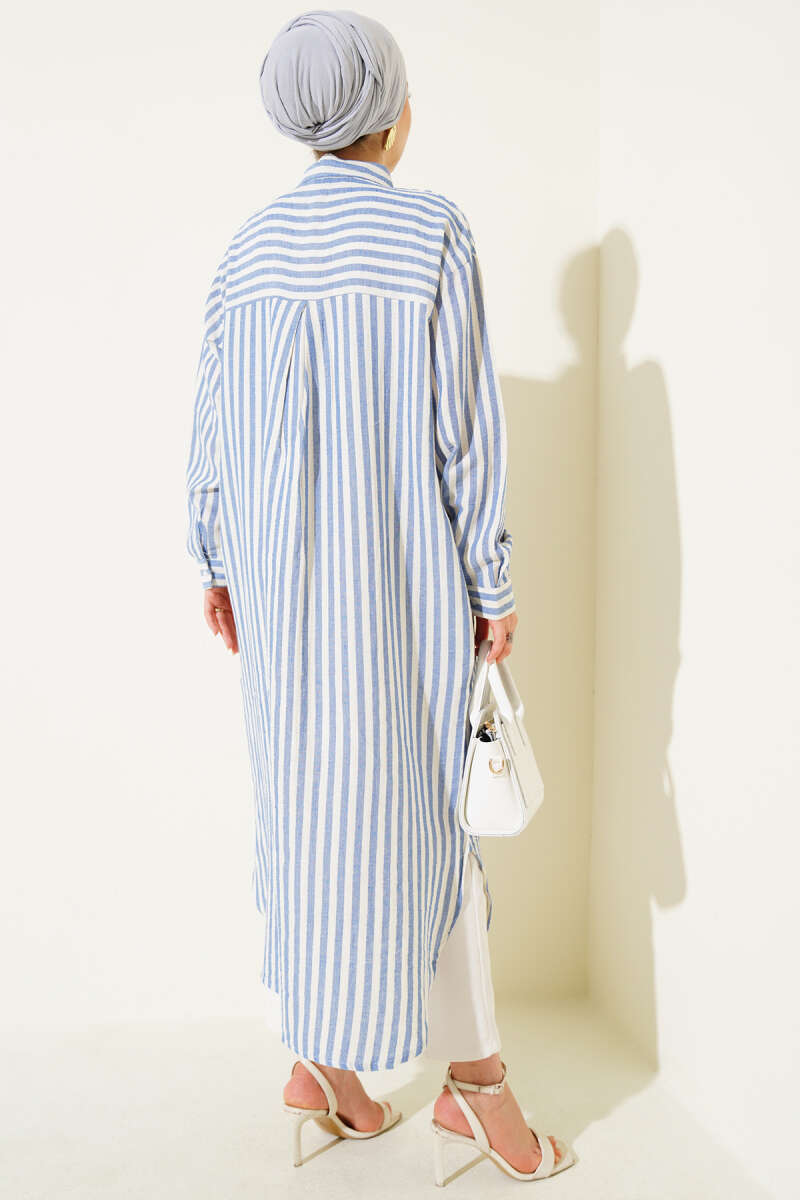 Dik Çizgili Uzun Keten Gömlek Lacivert