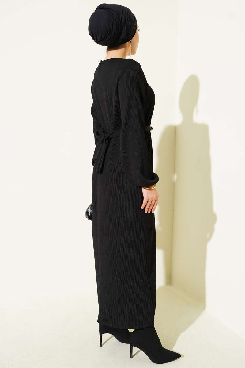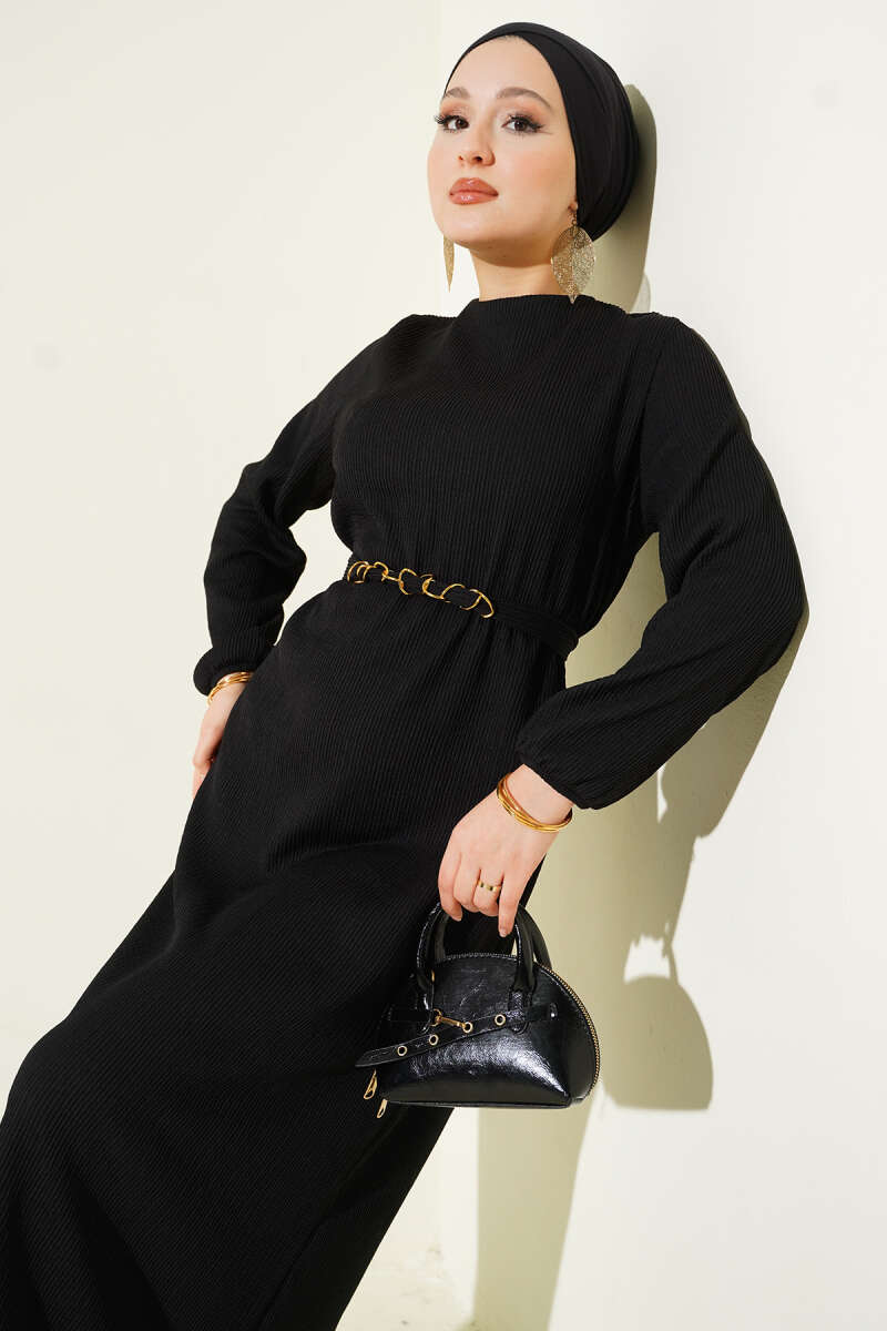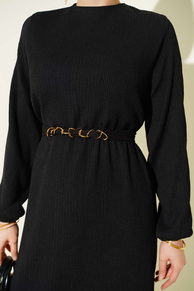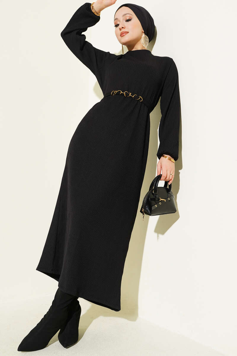 Baklava Desen Ajurlu Triko Elbise Siyah
