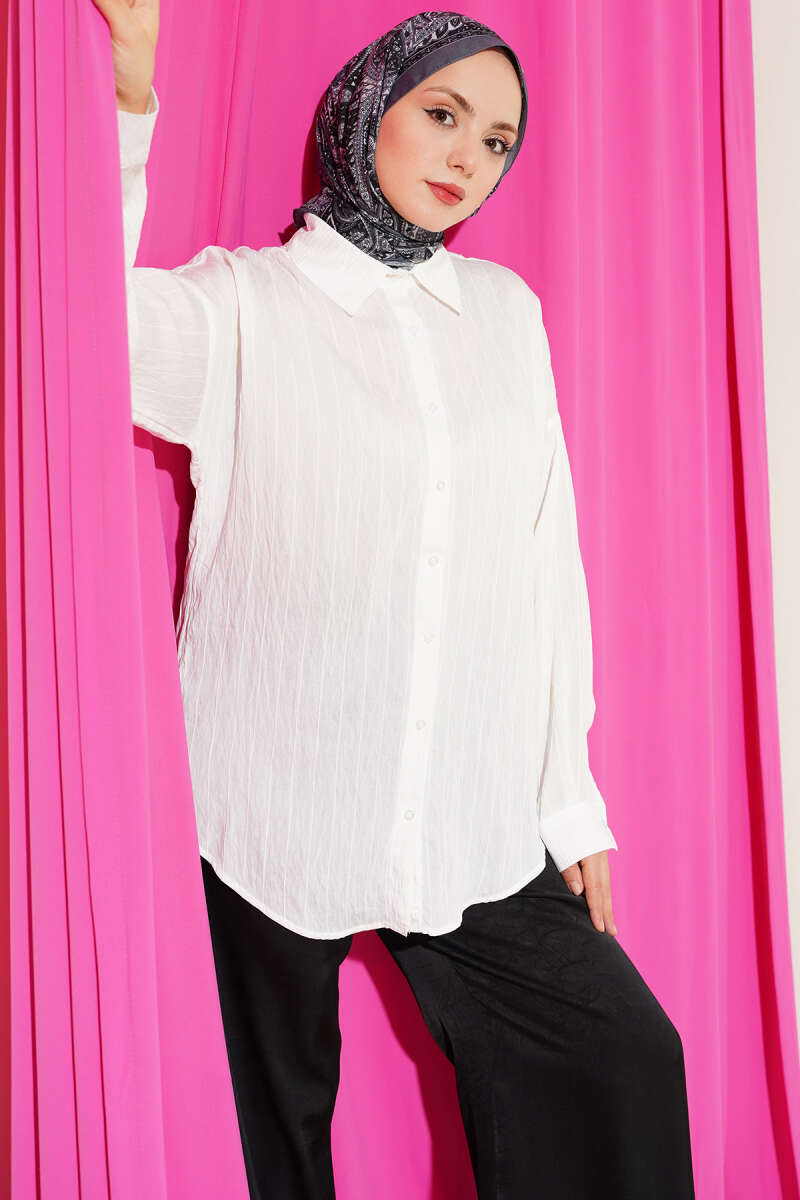 Dik Kabartma Çizgili Basic Gömlek Ekru