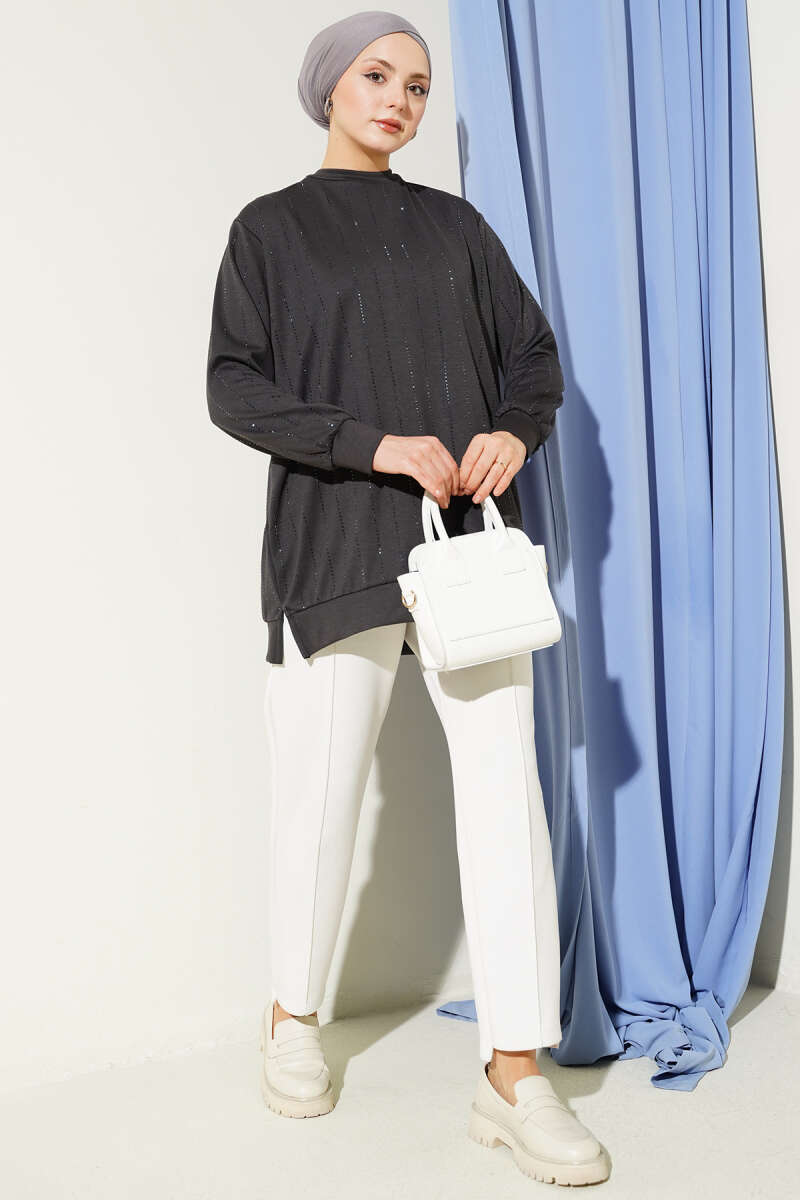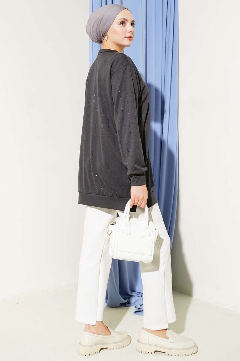 Dik Şerit Taşlı Loyşa Tunik Füme