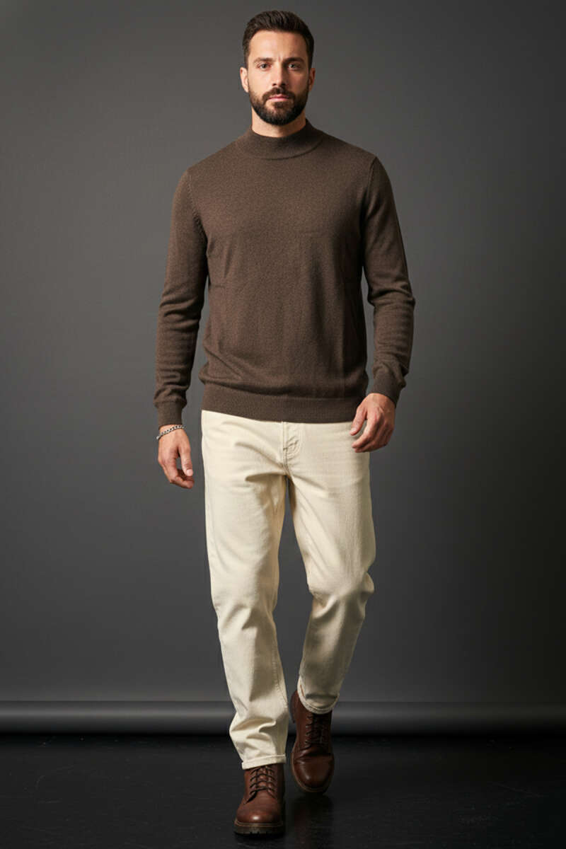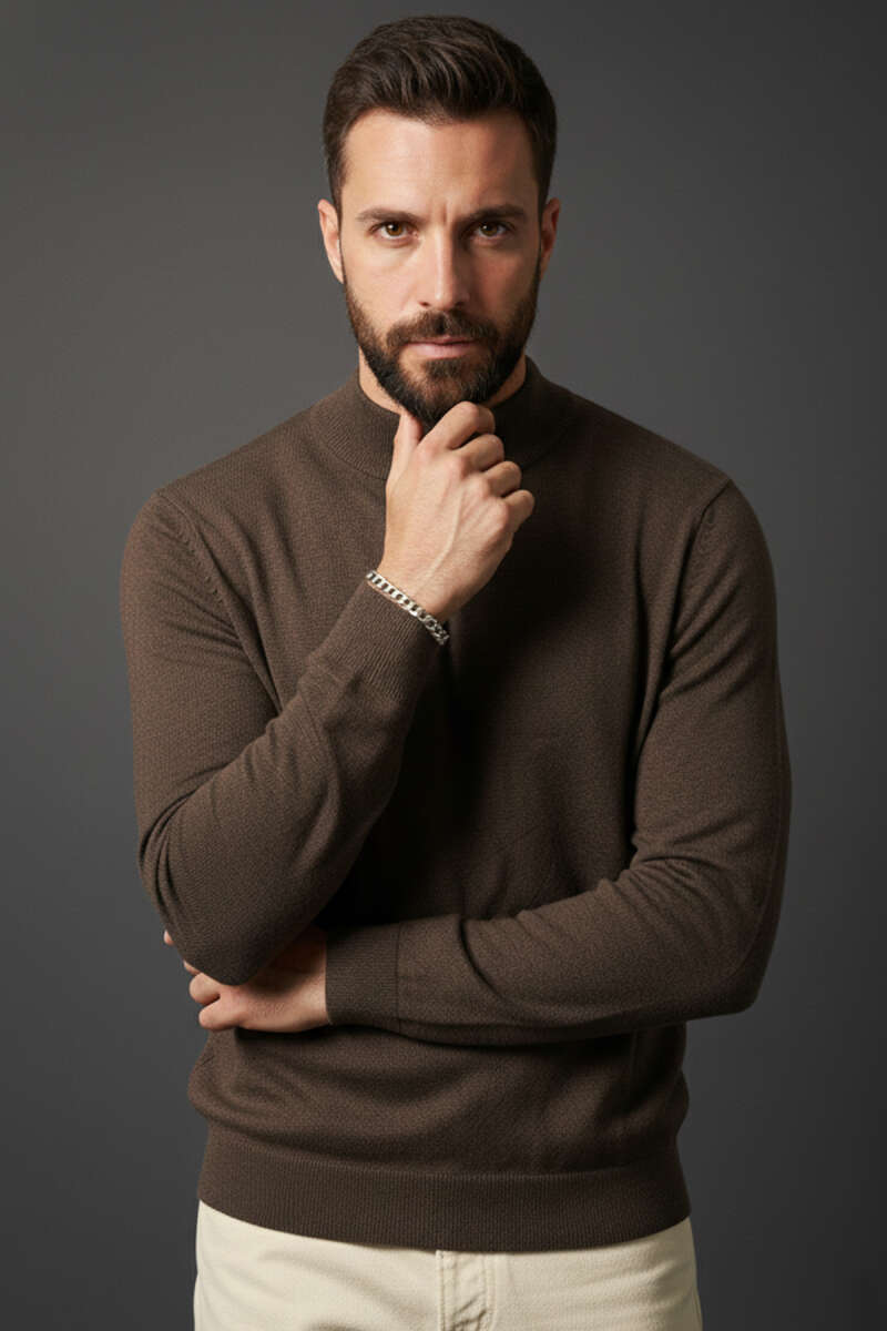 Dik Yaka Basic Erkek Triko Kazak Kahve