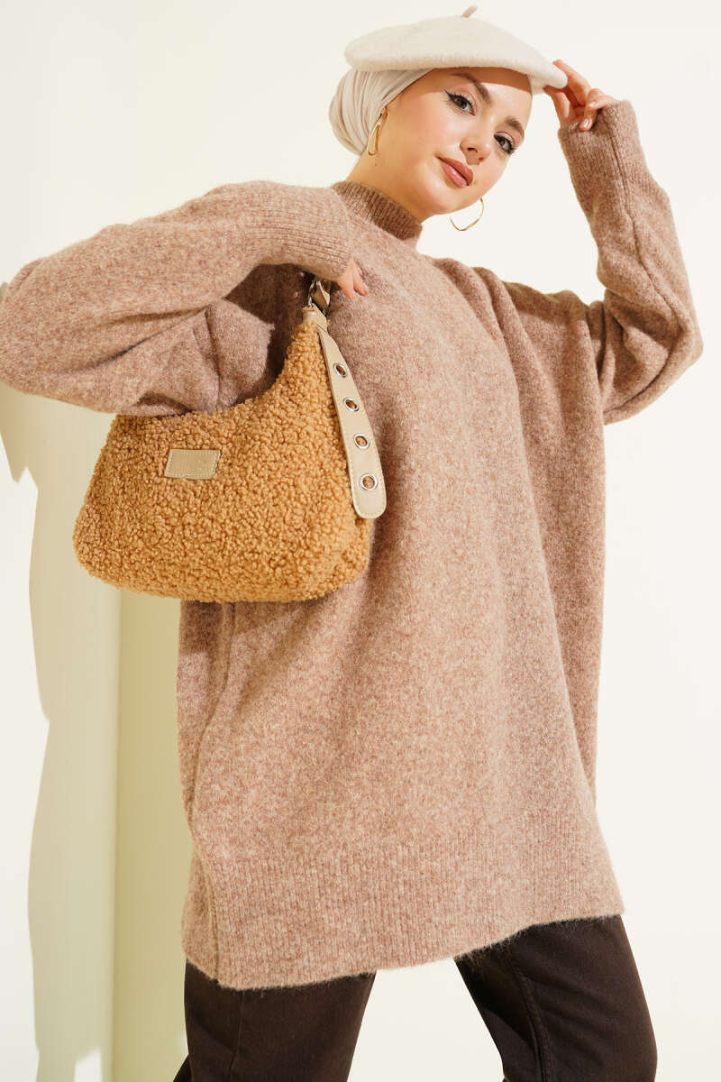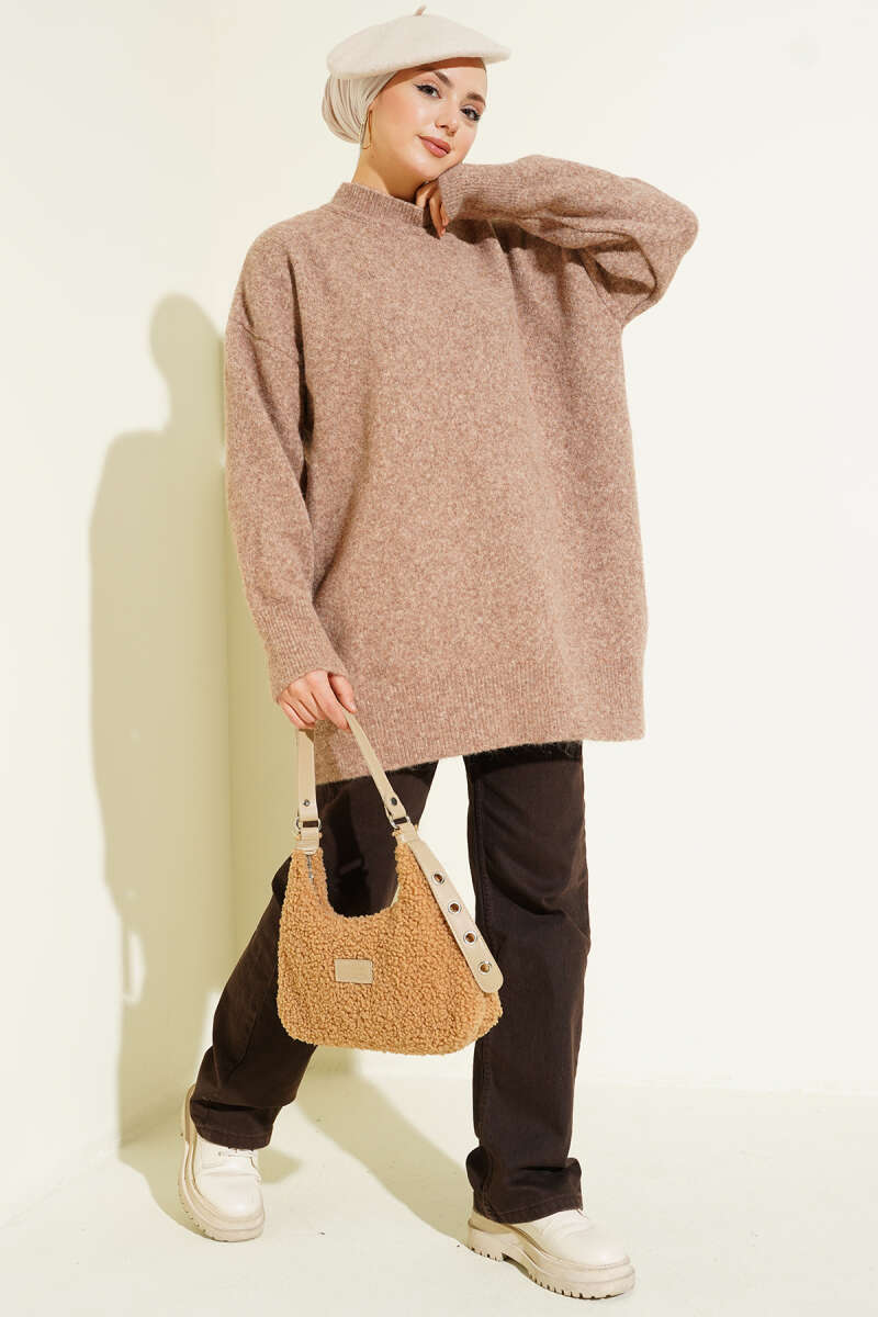 Dik Yaka Basic Yumoş Triko Tunik Kahve