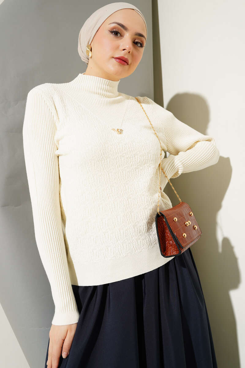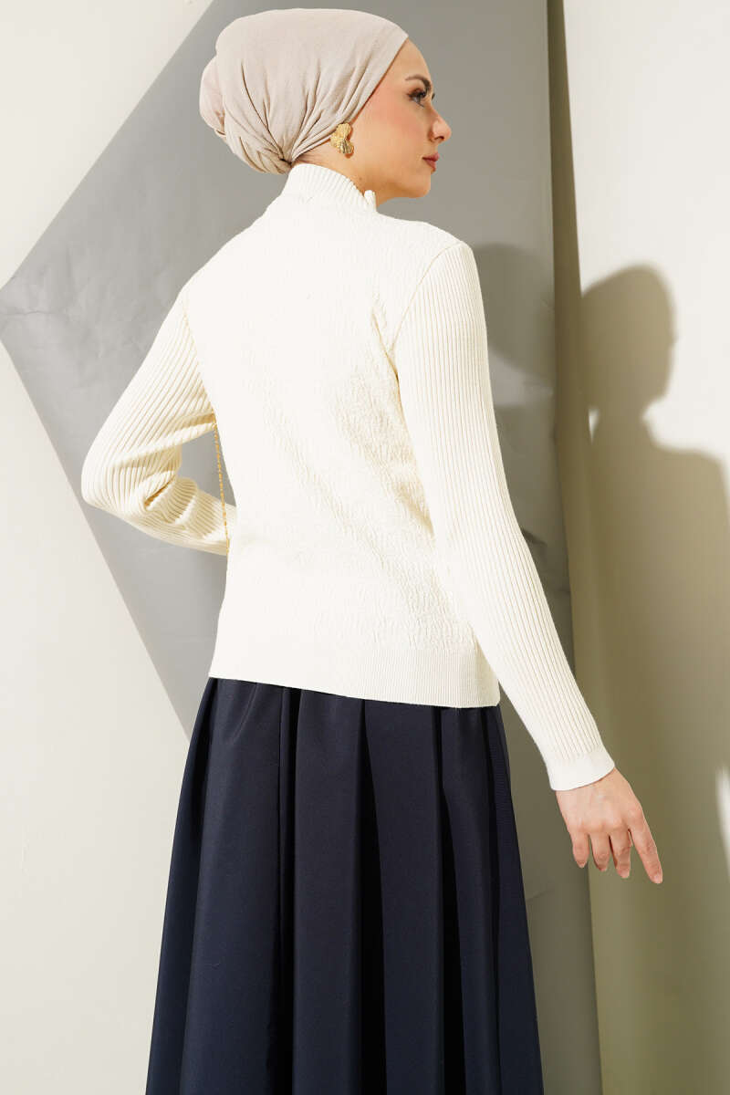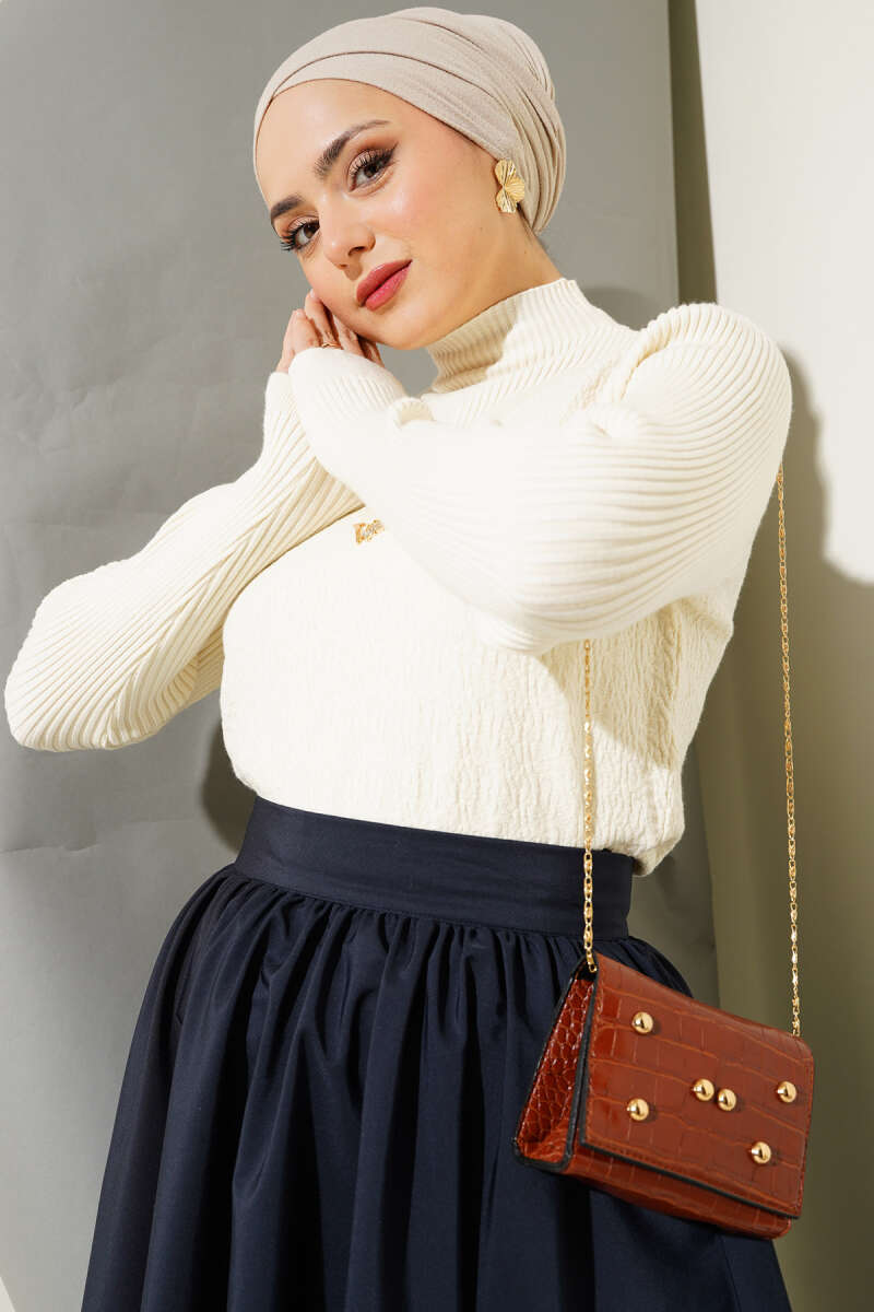 Dik Yaka Büzgülü Triko Kazak Vanilya