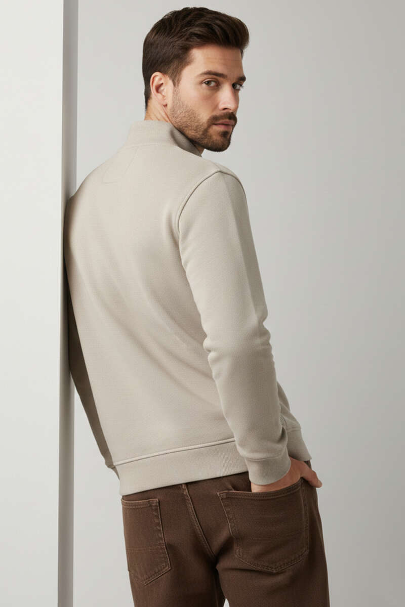 Polo Yaka Fermuarlı Basic Erkek Sweatshirt Taş