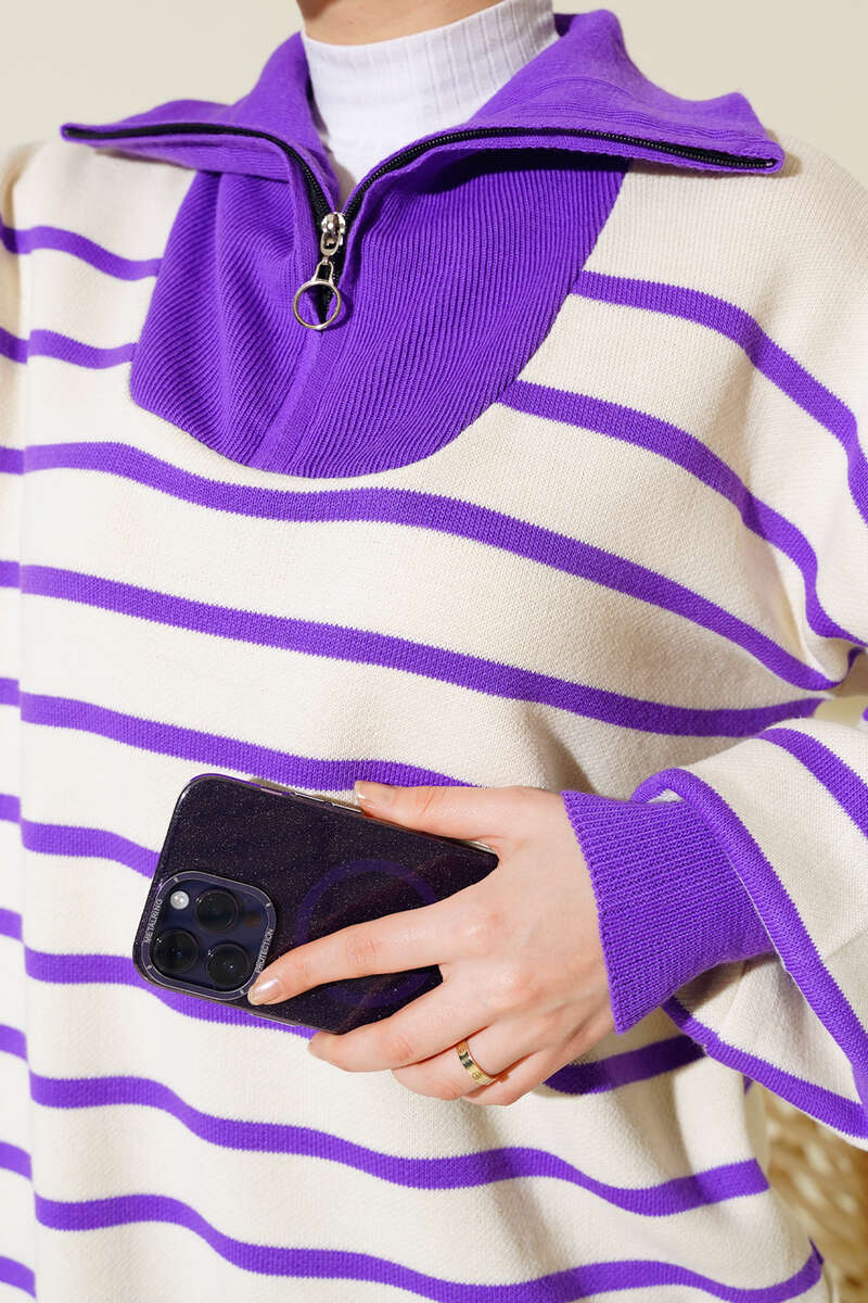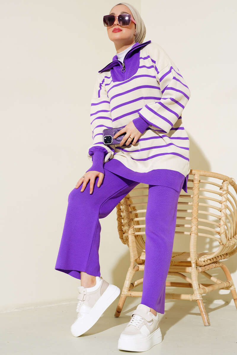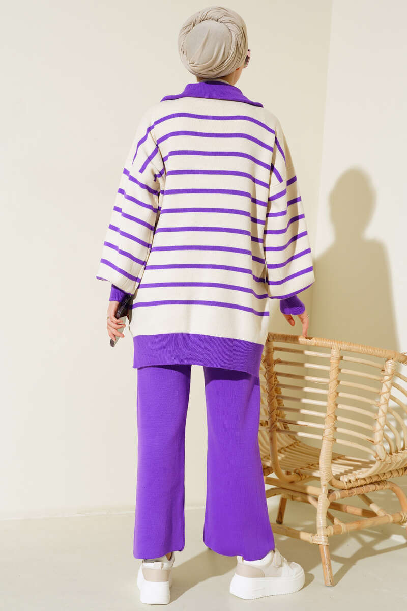 Dik Yaka Çizgili Triko İkili Takım Mor