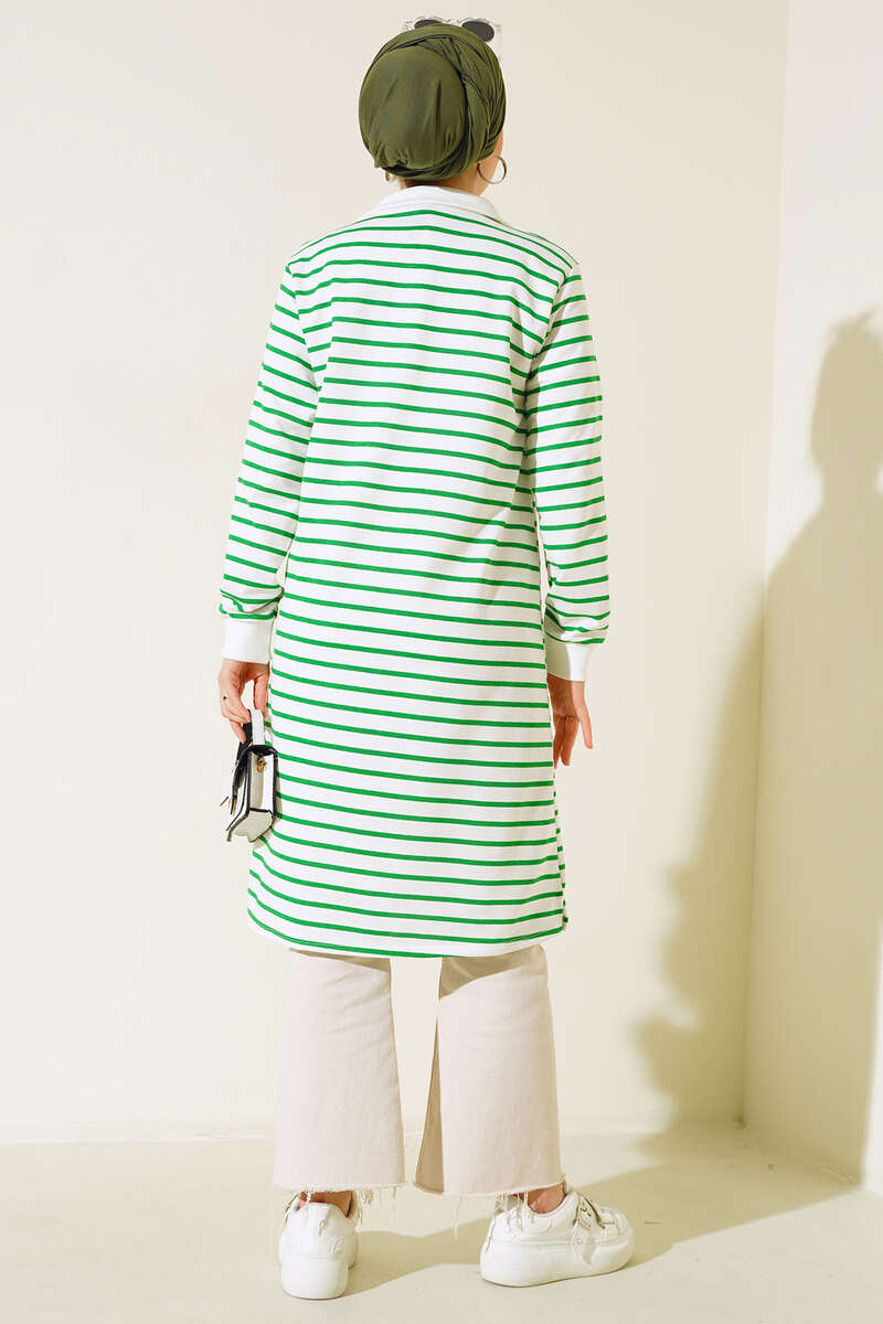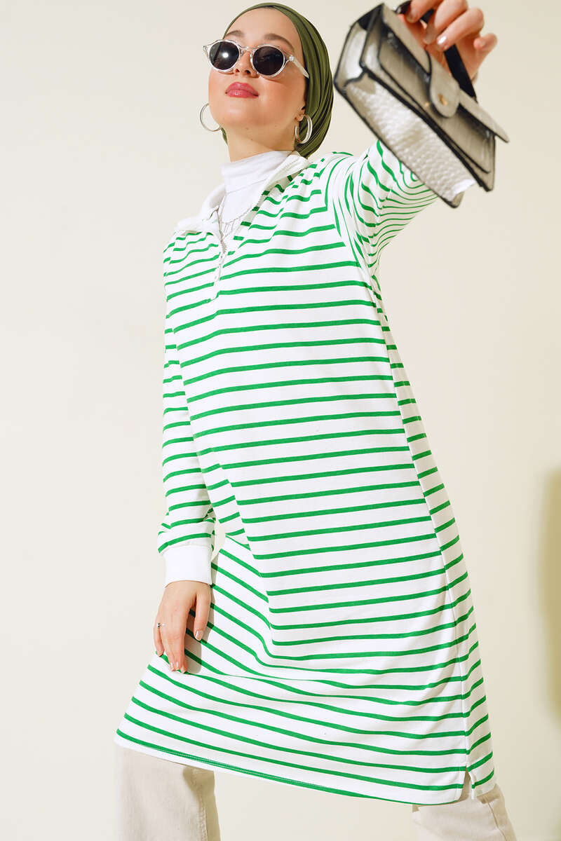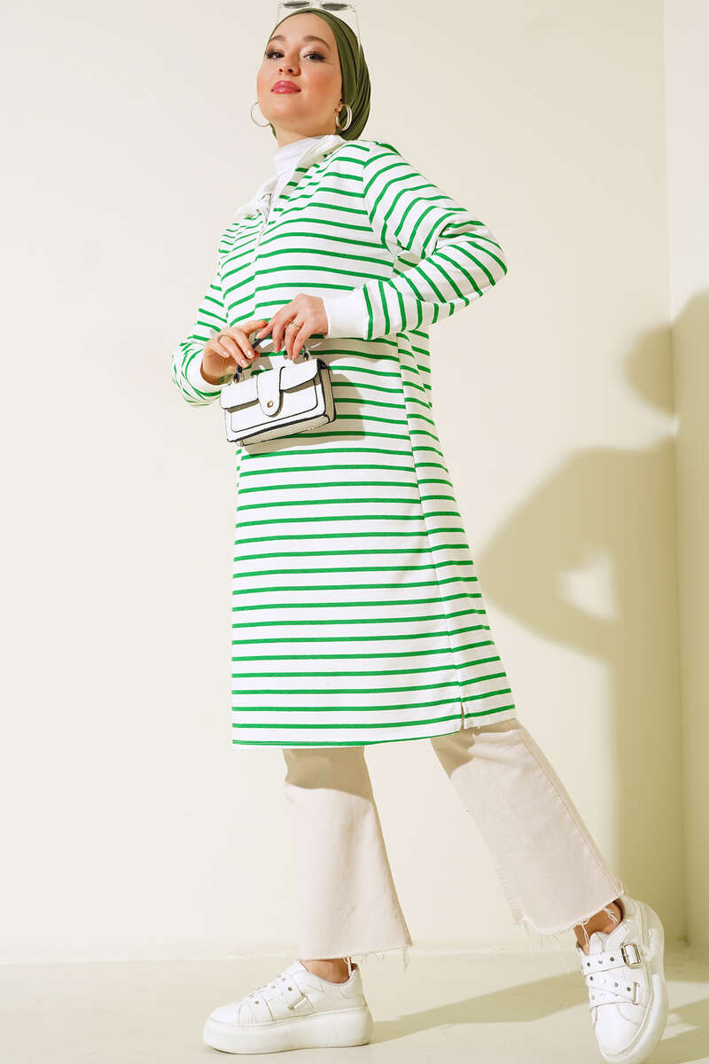 Yeni sezon tuniğimiz dik yaka modeldir. Yakası fermuarlı olup etek uçları yırtmalıdır. Bilekleri esnektir. Üzerindeki yatay çizgiler tuniğimize hareket katmaktadır. Rahatlıkla kombinleyeceğiniz tuniğimiz favorileriniz arasına girecektir.