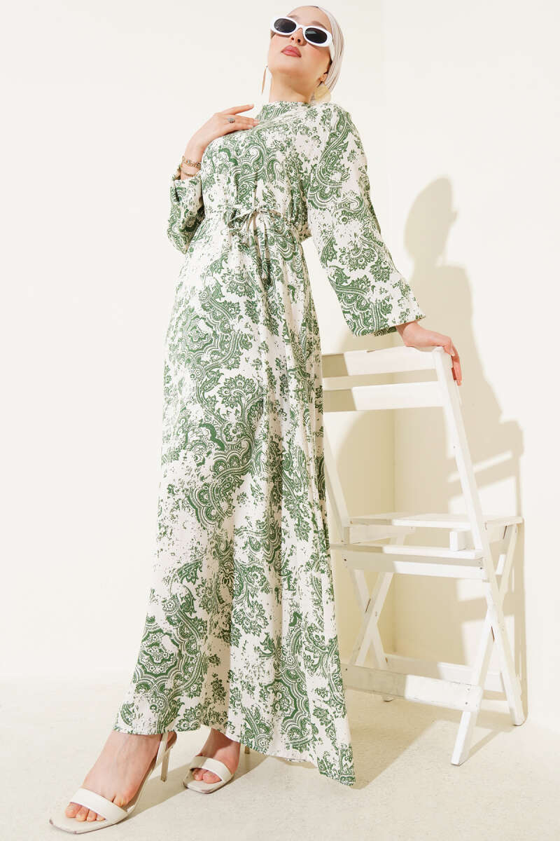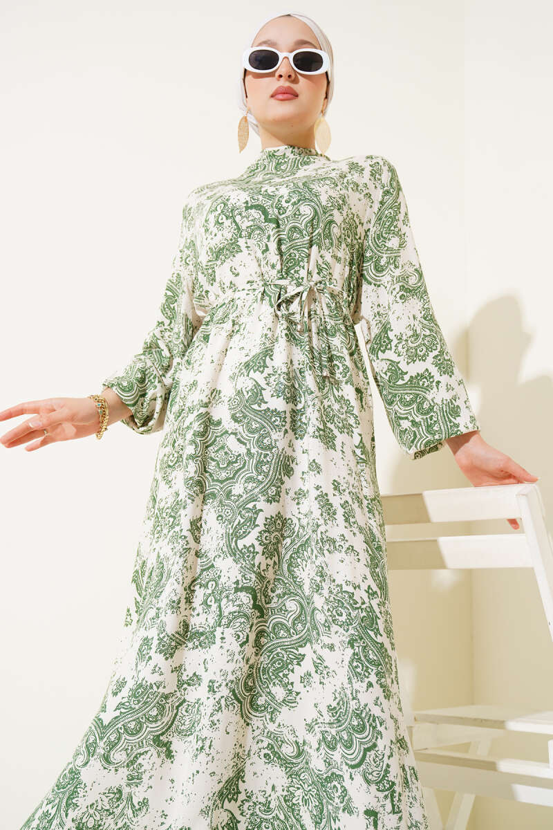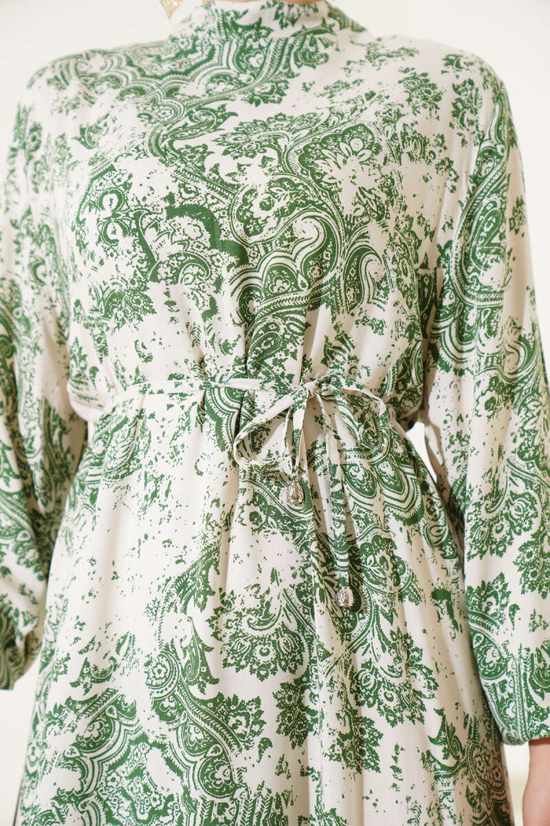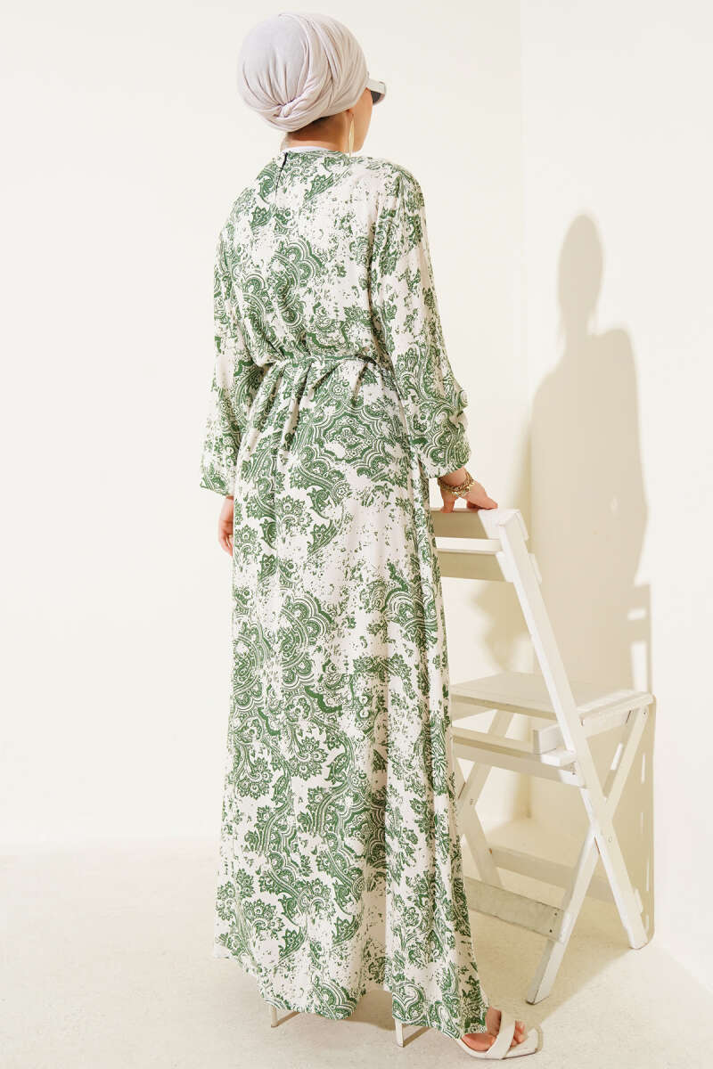 Boydan Düğmeli Pensli Kuşaklı Elbise Haki