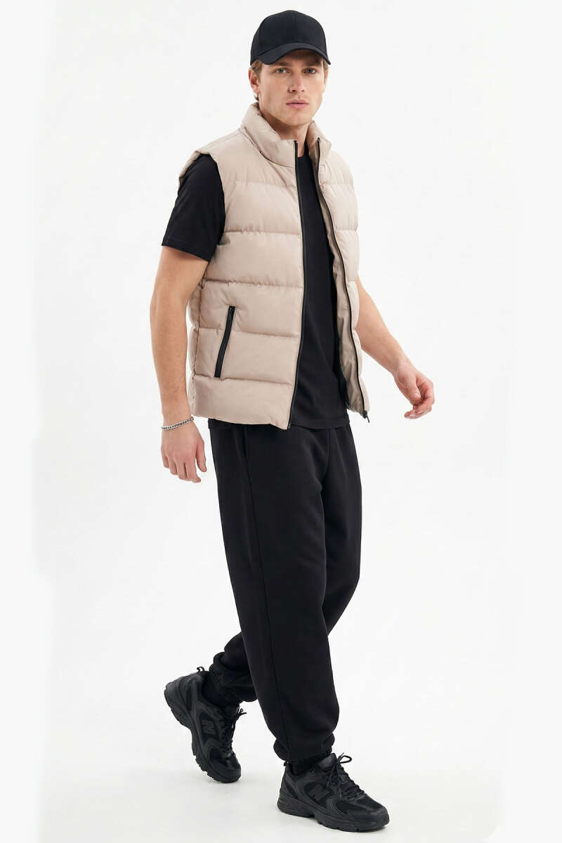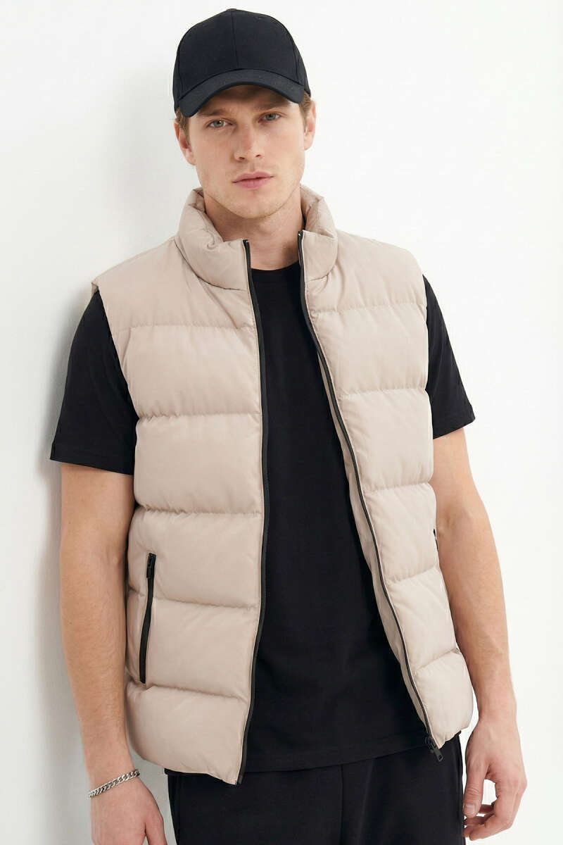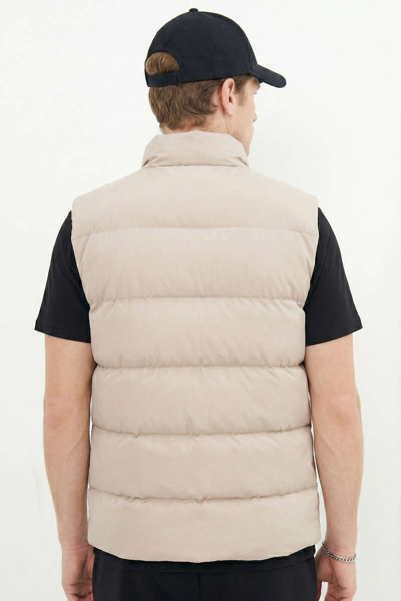 Dik Yaka Fermuarlı Erkek Şişme Mont Bej