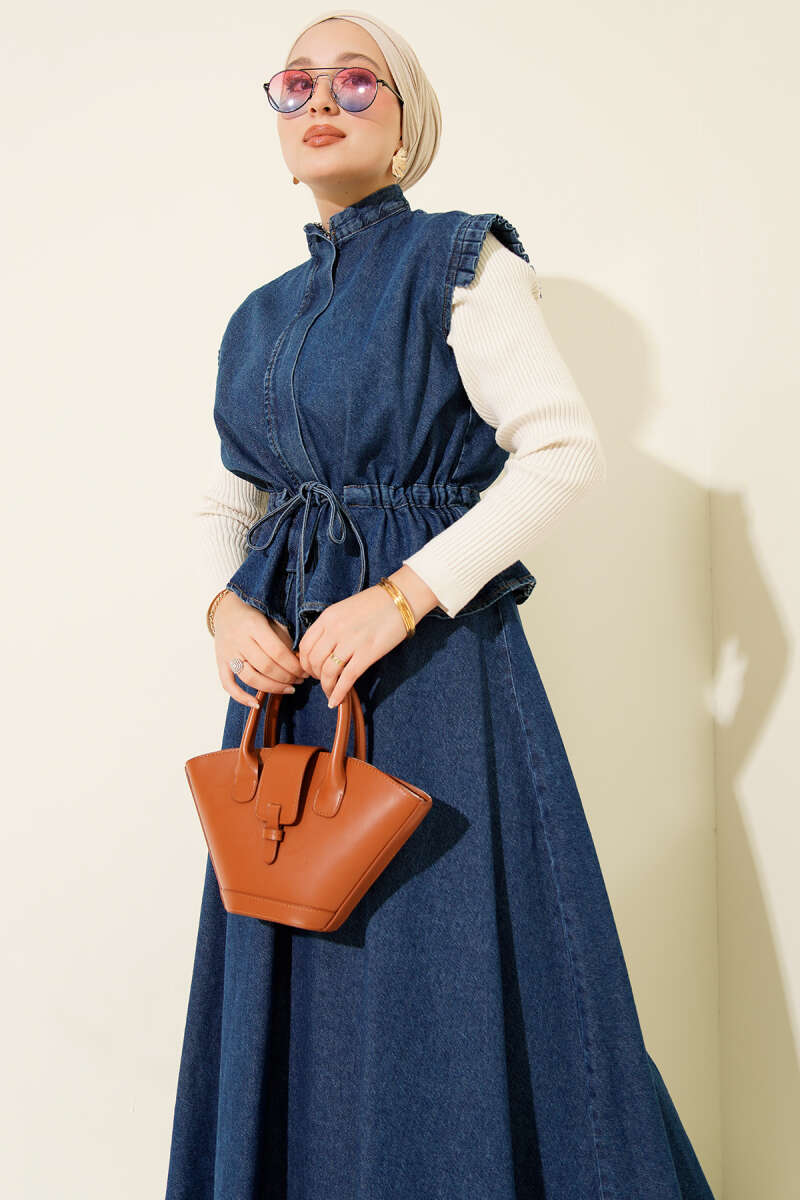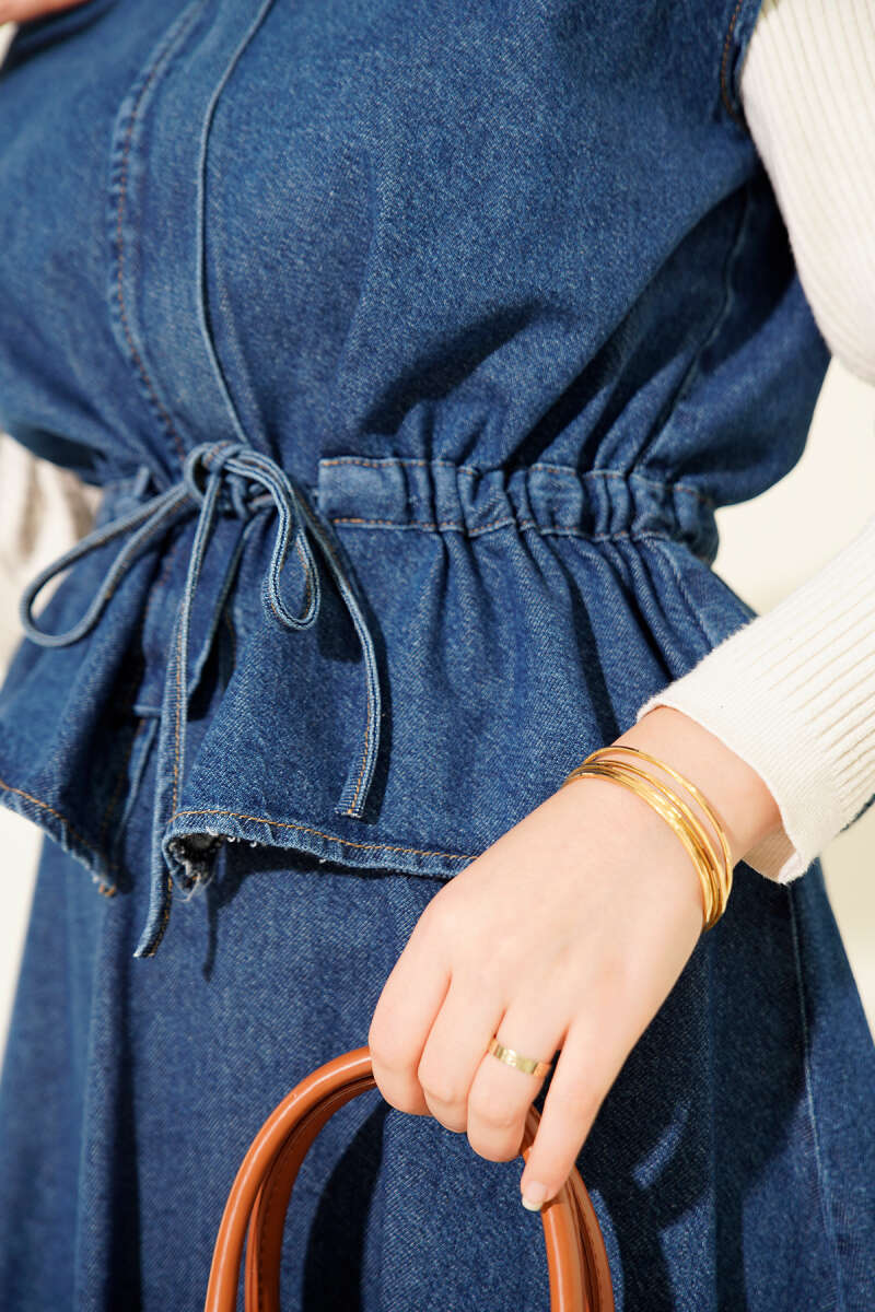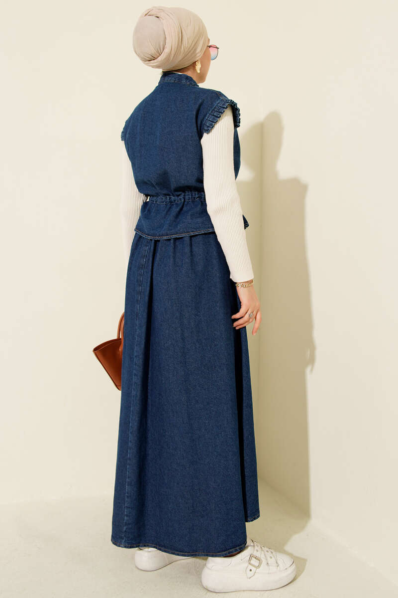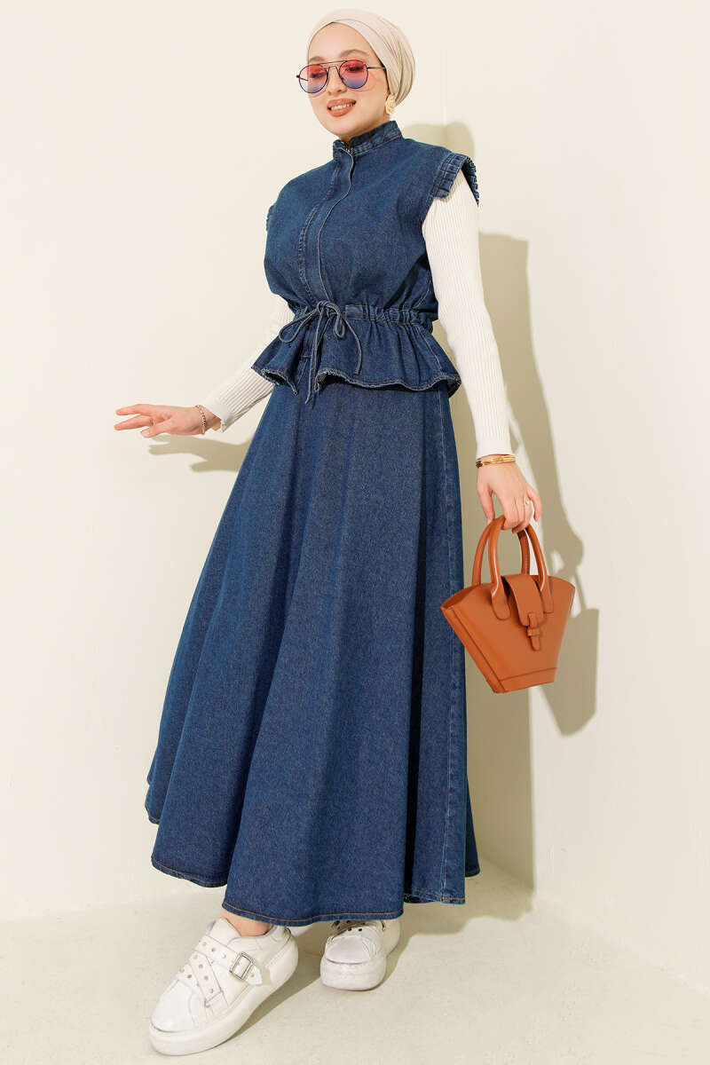 Dik Yaka Fermuarlı Etekli Kot İkili Takım Açık Mavi