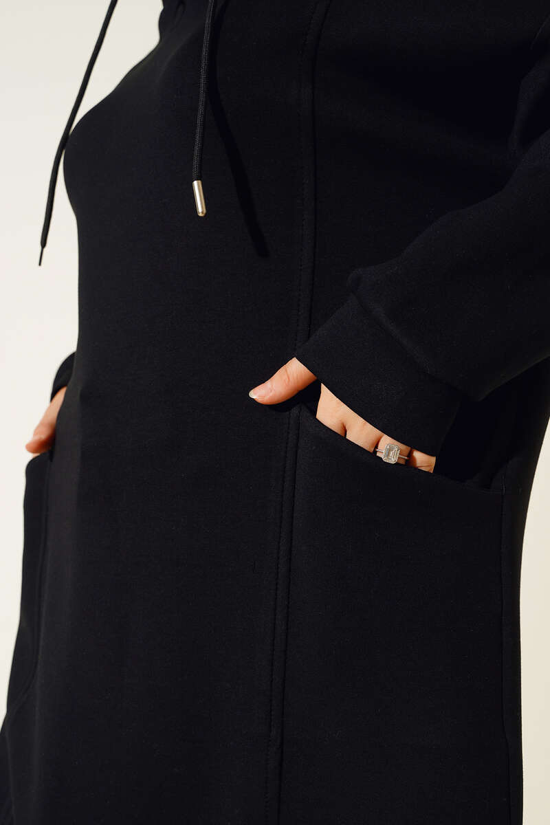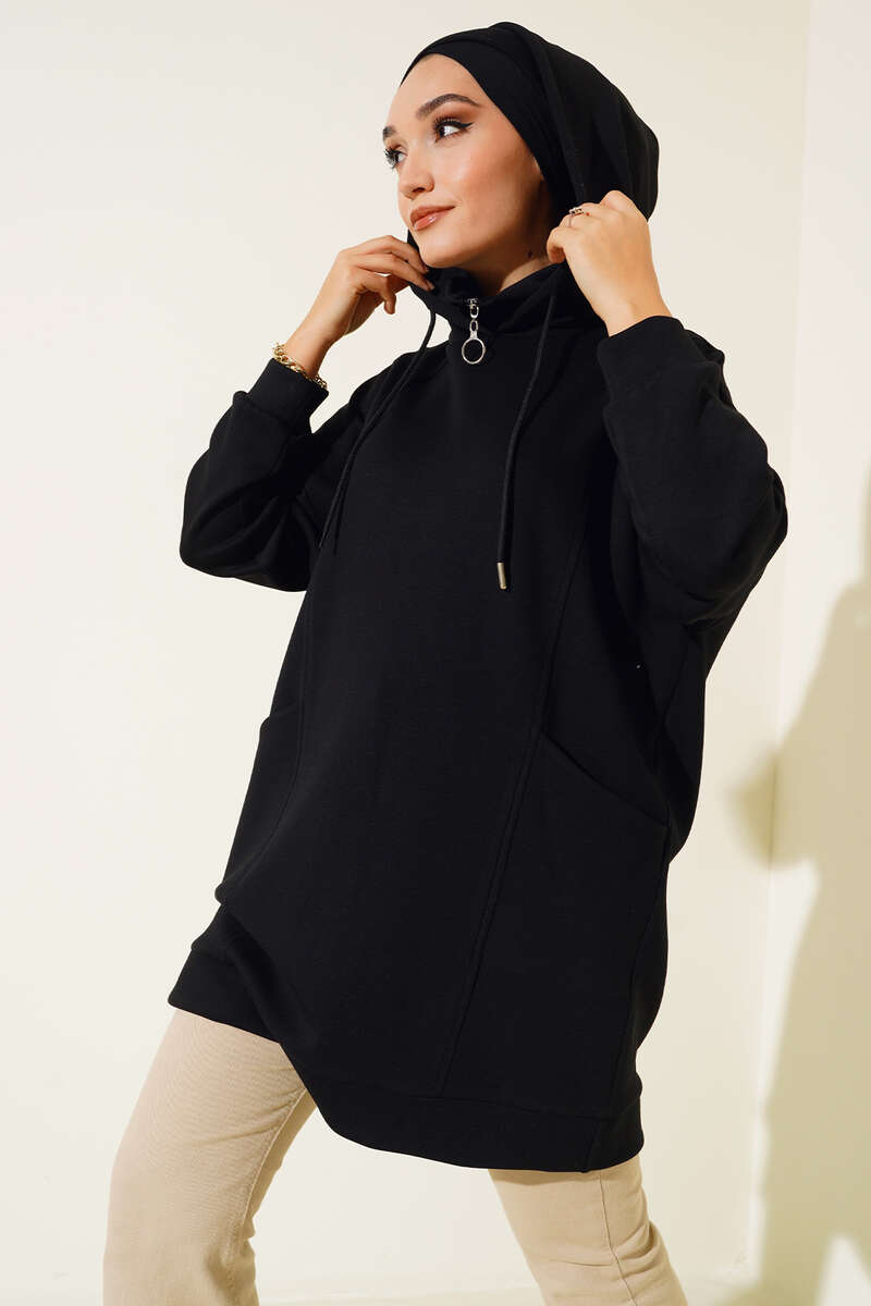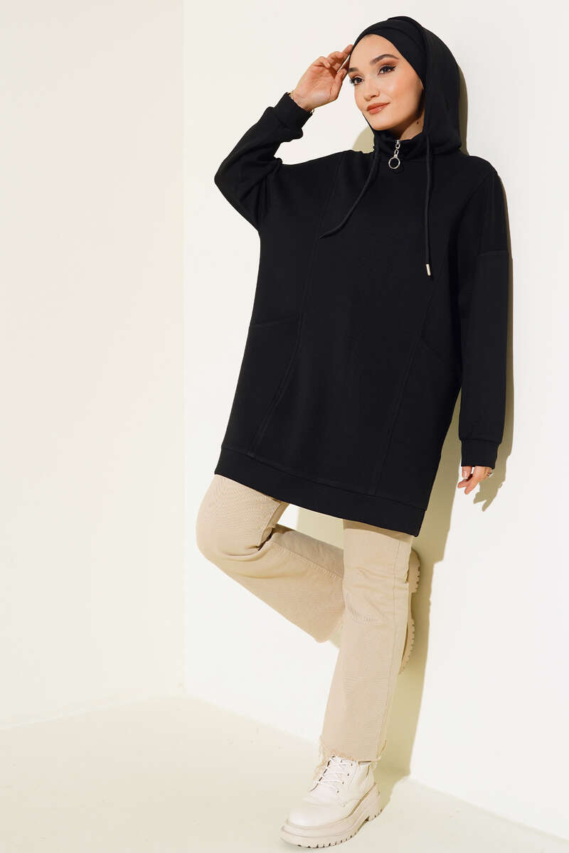 Yeni sezon tasarım tuniğimiz detayları ile dikkat çekmektedir. Tuniğimiz kapüşonu bağcıklı modeldir. Yakası dik yakalıdır ve fermuar detayı bulunmaktadır. Düşük omuzlu olup oversize modele sahiptir. İki adet çapraz torba cepleri bulunmaktadır.