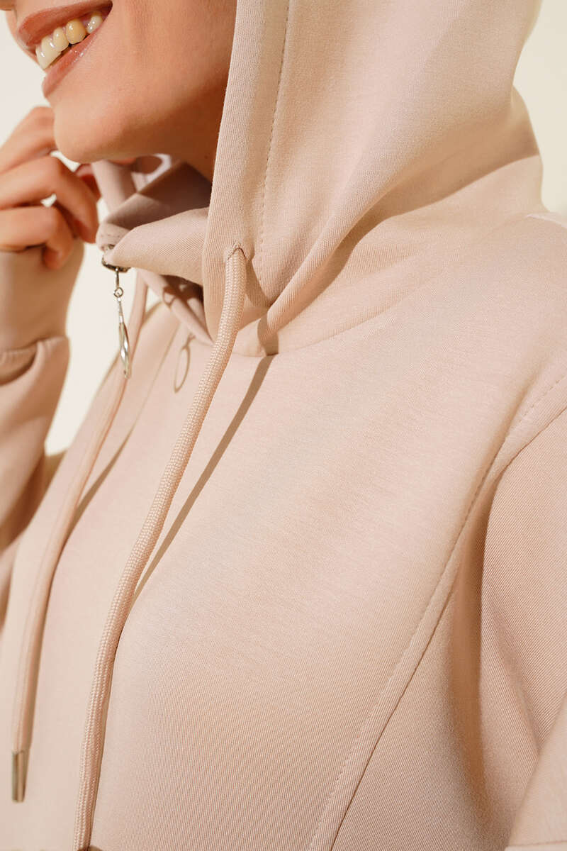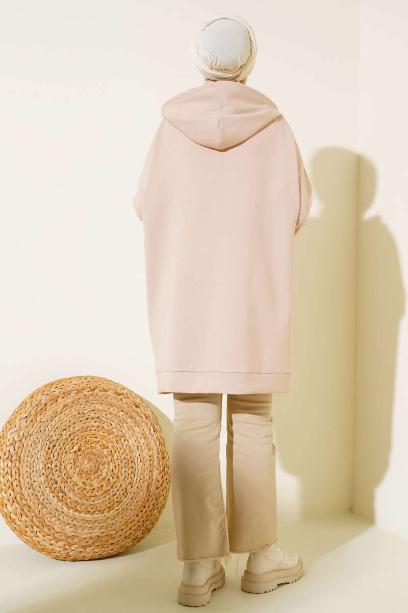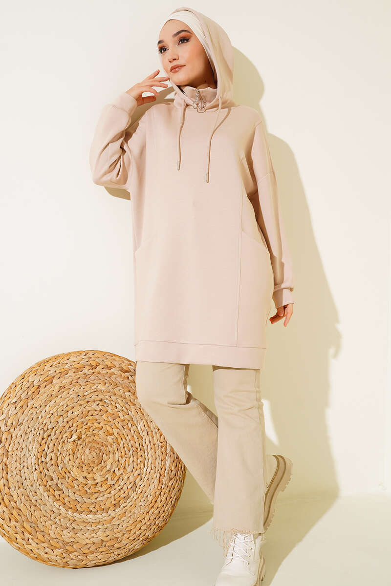 Yeni sezon tasarım tuniğimiz detayları ile dikkat çekmektedir. Tuniğimiz kapüşonu bağcıklı modeldir. Yakası dik yakalıdır ve fermuar detayı bulunmaktadır. Düşük omuzlu olup oversize modele sahiptir. İki adet çapraz torba cepleri bulunmaktadır.