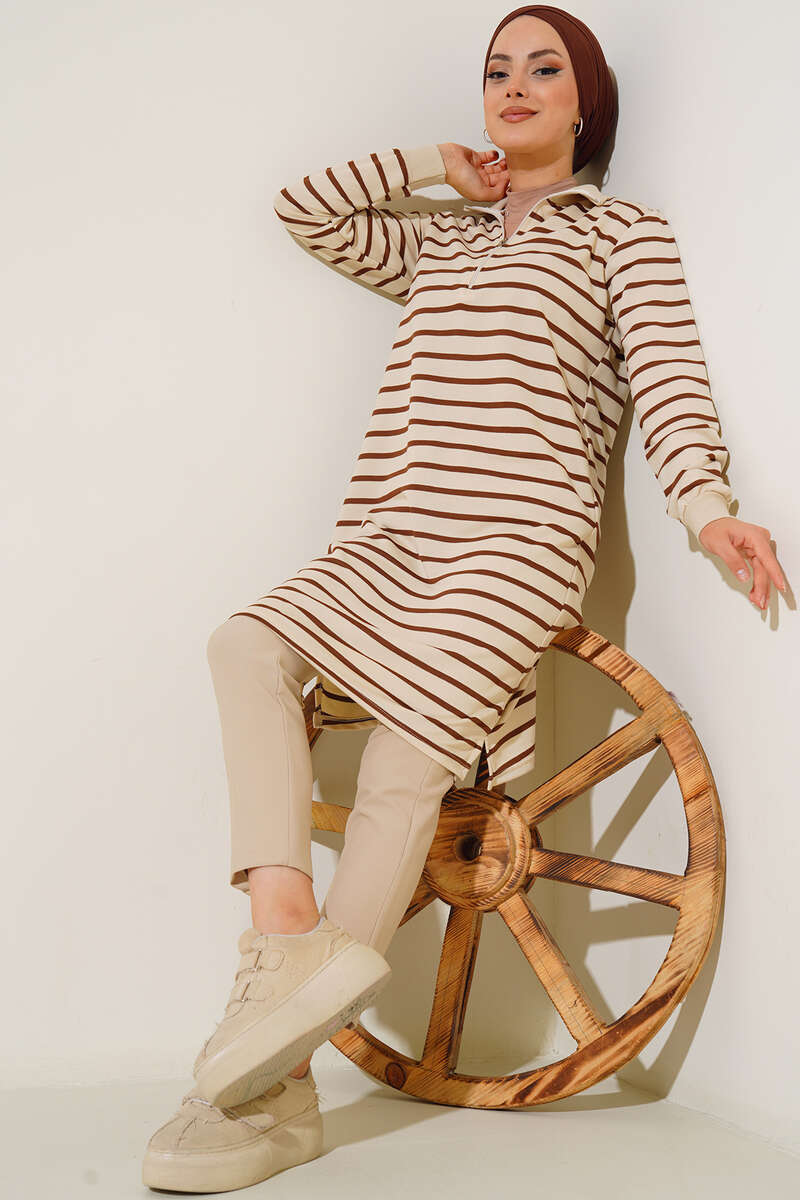 Tuniğimiz yatay çizgili modeldir. Yakası dik yakalı ve fermuar detaylıdır. Bilekleri garnilidir. İki yan kısmında minik yırtmaç detayları bulunmaktadır.