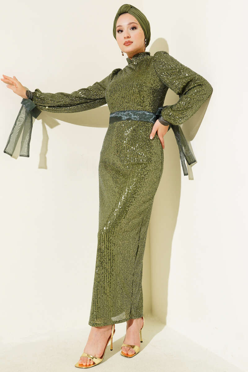 Dik Yaka Kuşaklı Pul Payet Abiye Elbise Zümrüt