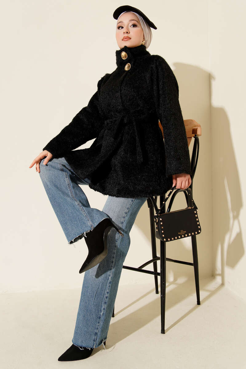 Dik Yaka Kuşaklı Sakallı Ceket Kahve